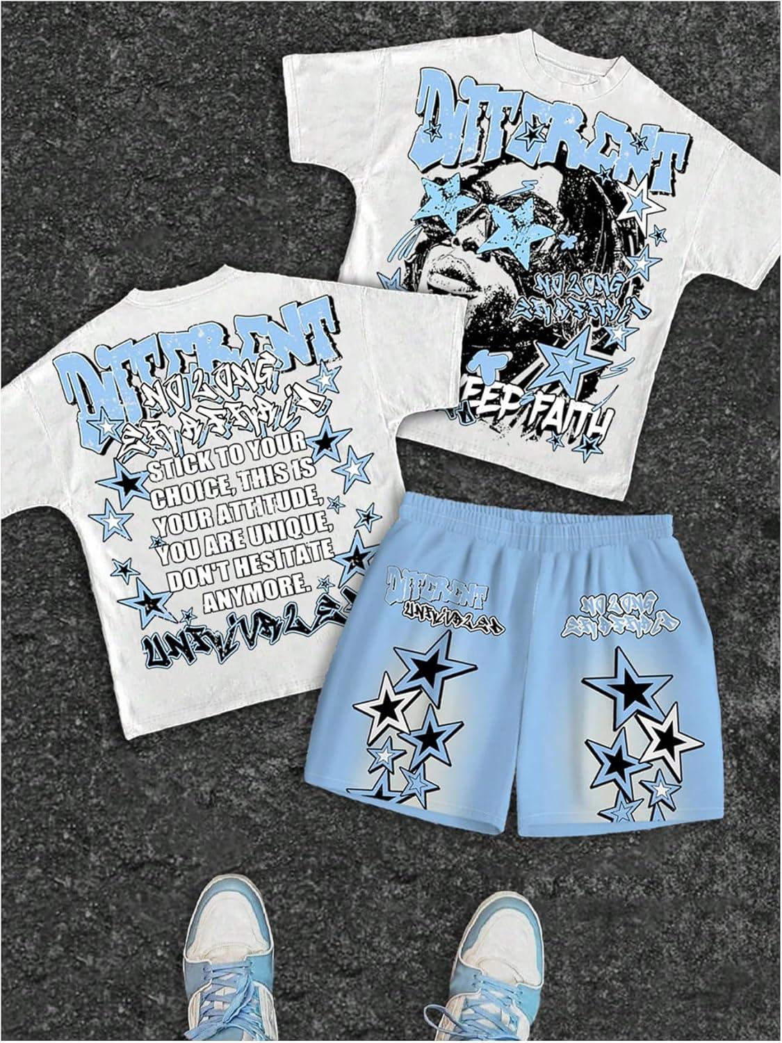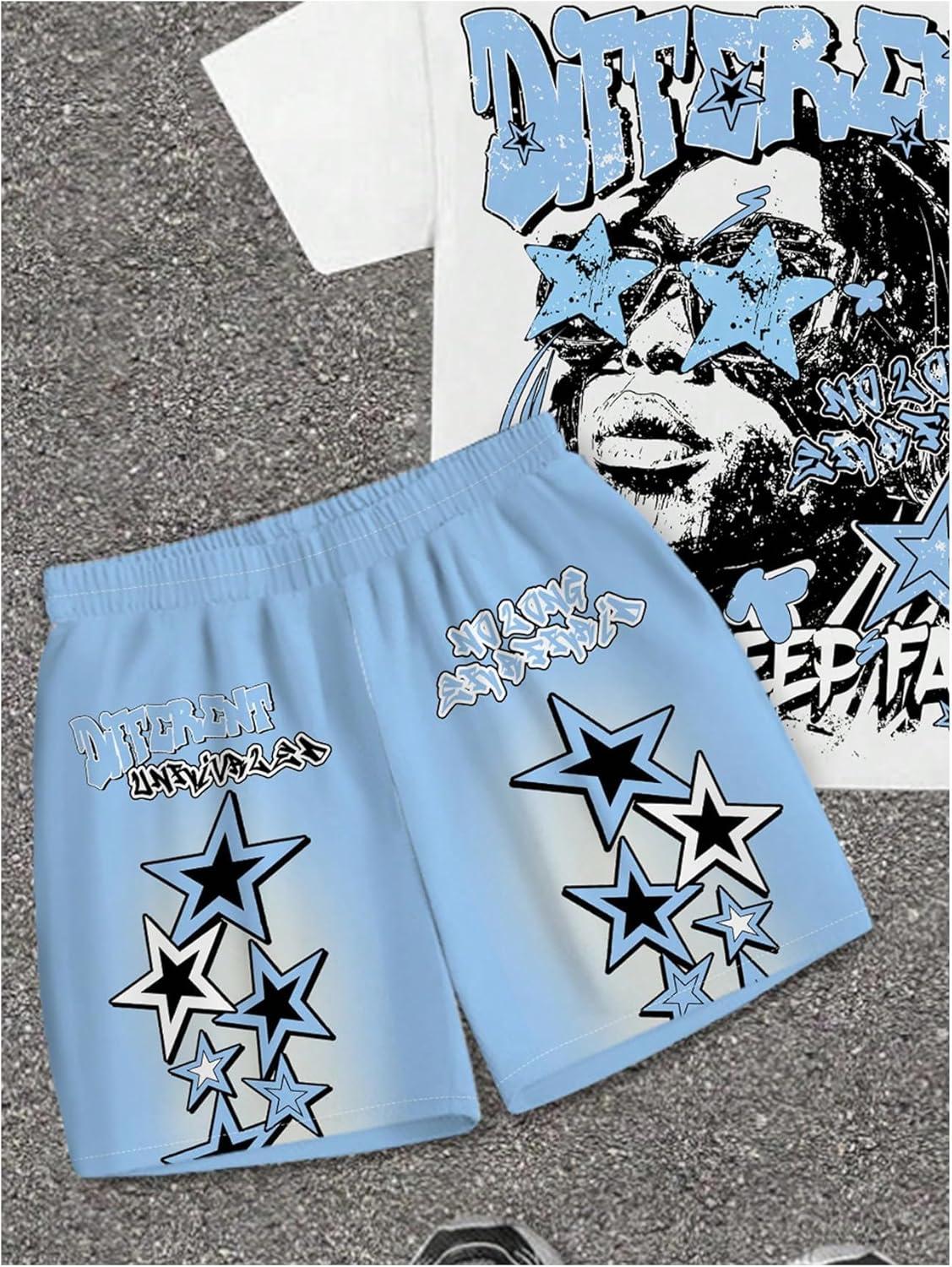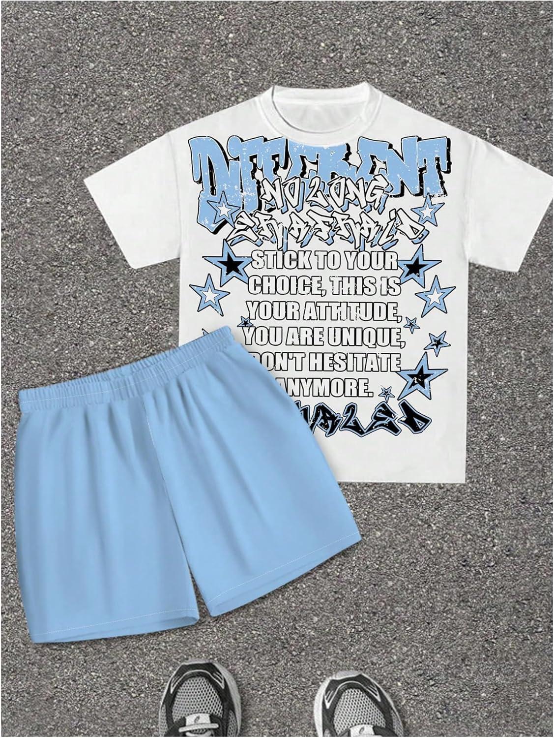 SOLY HUX Boy’s Outfits Graphic Short Sleeve T Shirts and Shorts 2 Piece Set Summer Clothes(Blue White Graphic)