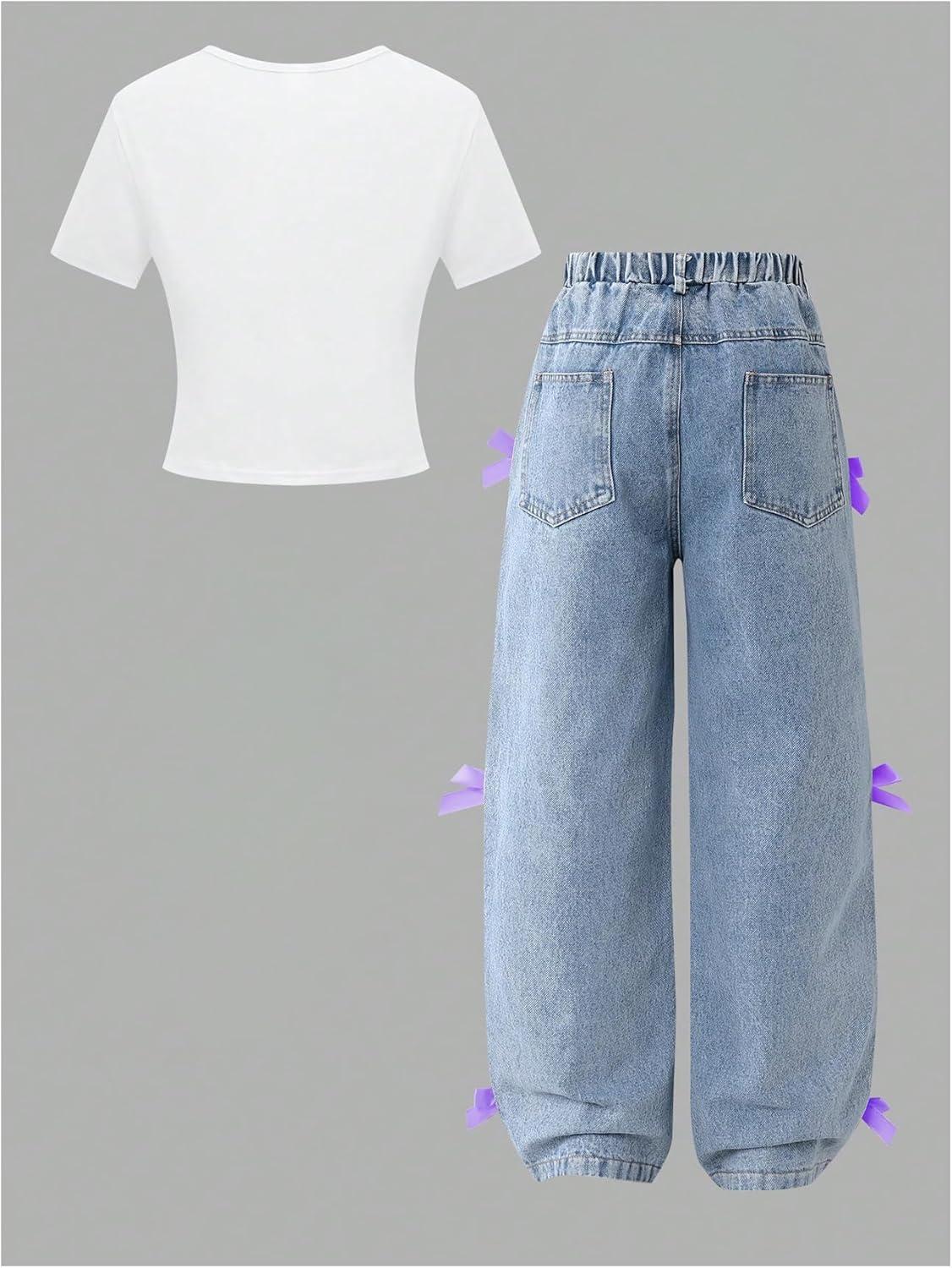 SOLY HUX Girl’s 2 Piece Outfits Cute Bow Graphic Short Sleeve T Shirt and Jean Pants Set Streetwear(Multicoloured)