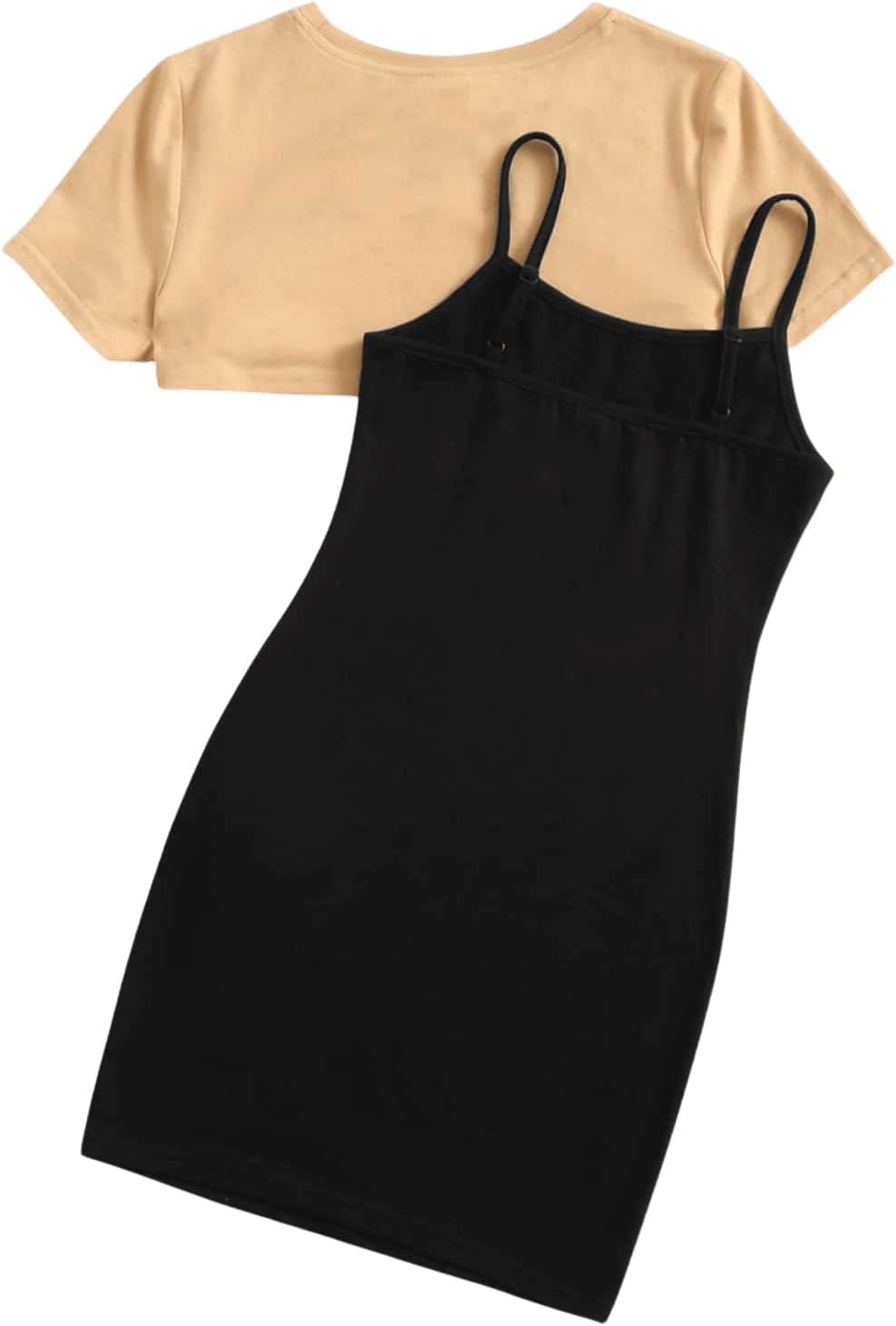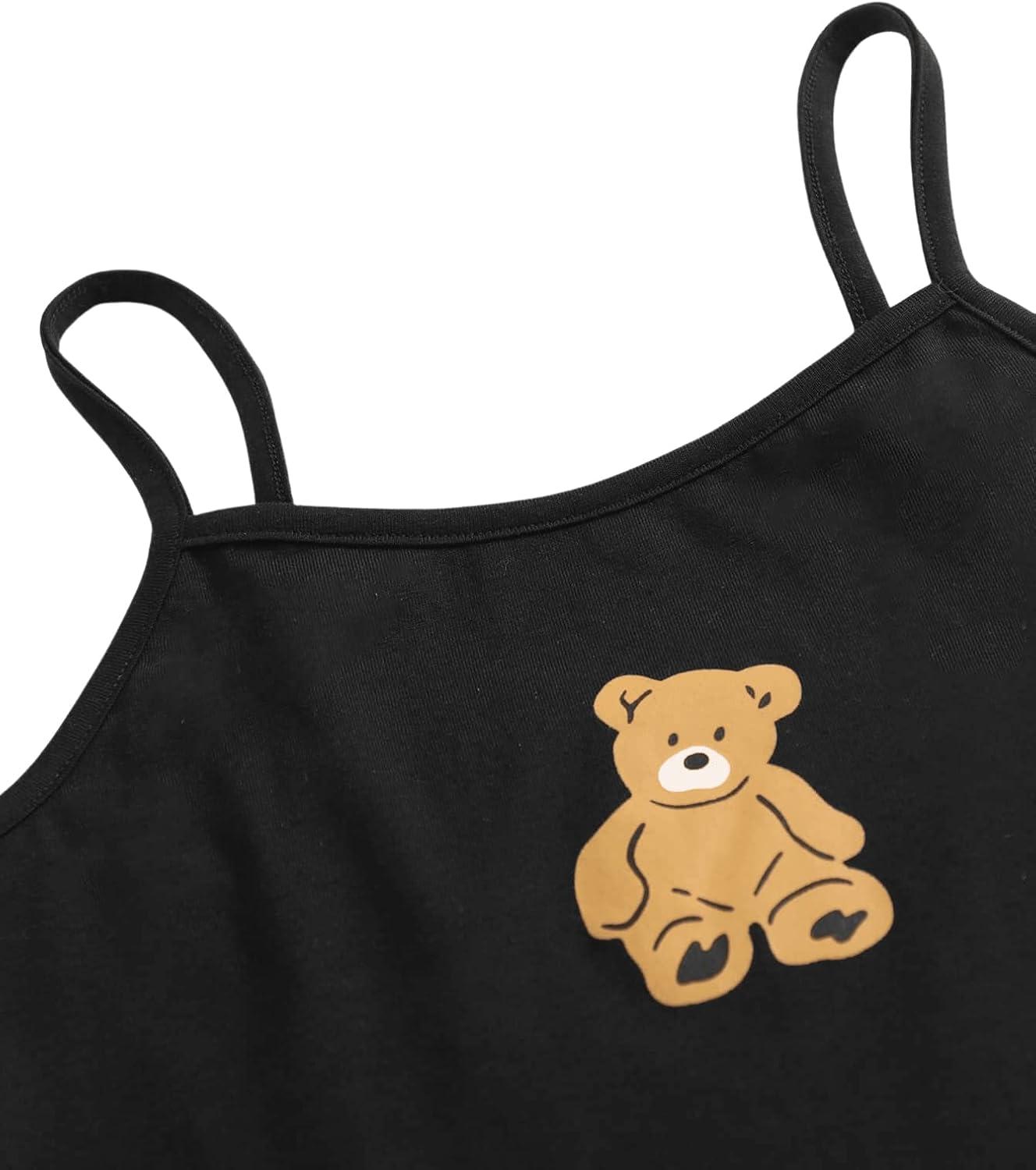 SOLY HUX Girl’s 2 Piece Outfits Short Sleeve Crop Top and Cartoon Print Cami Dress Set(Black)