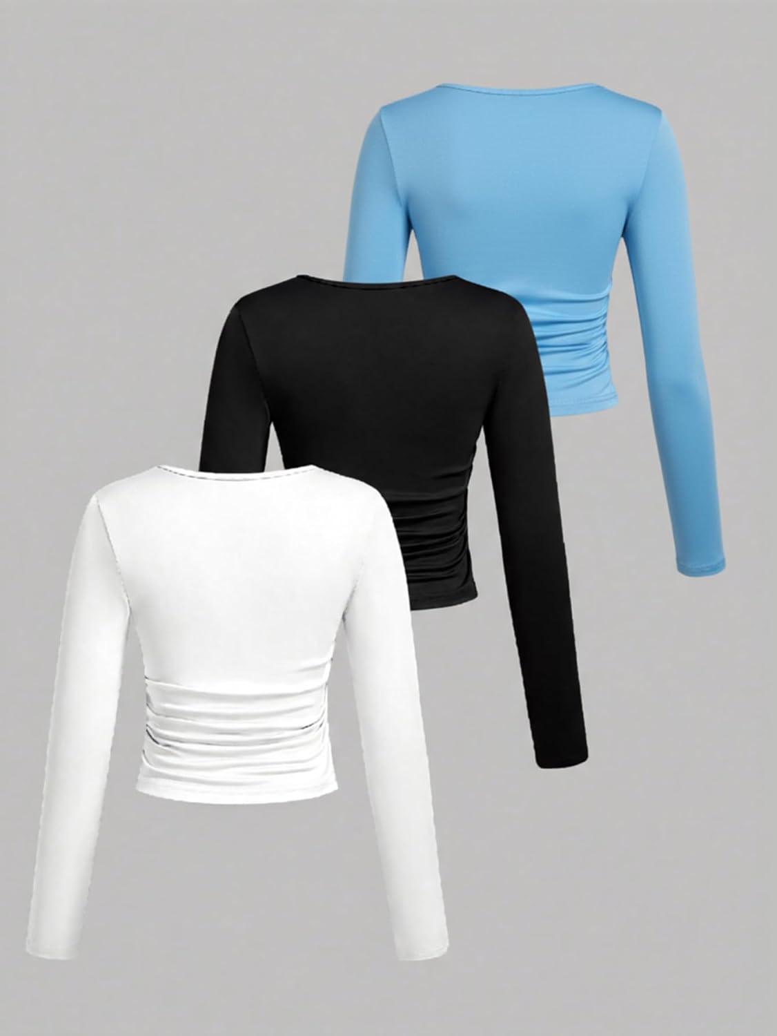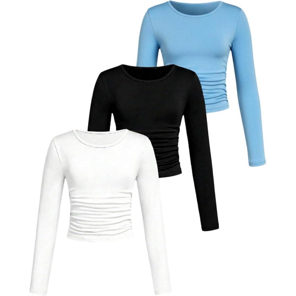 SOLY HUX Girl’s 3 Piece T Shirt Crew Neck Long Sleeve Ruched Crop Tops Slim Fit Solid Basic Tee(White Black and Blue)