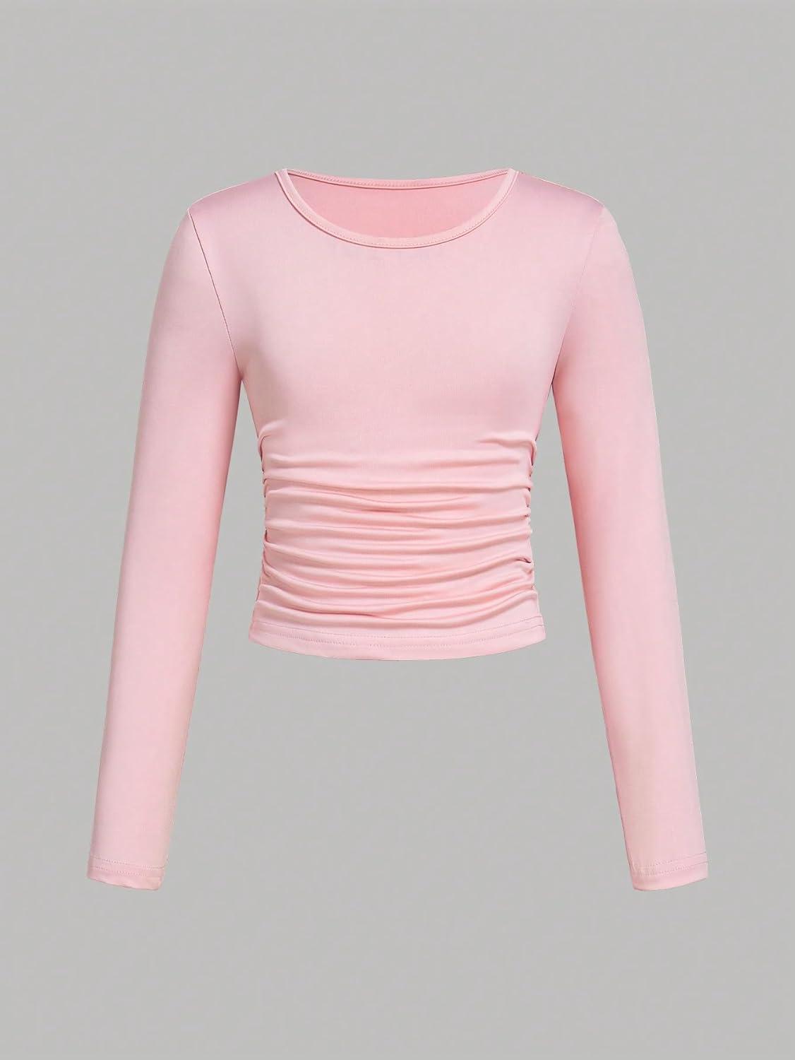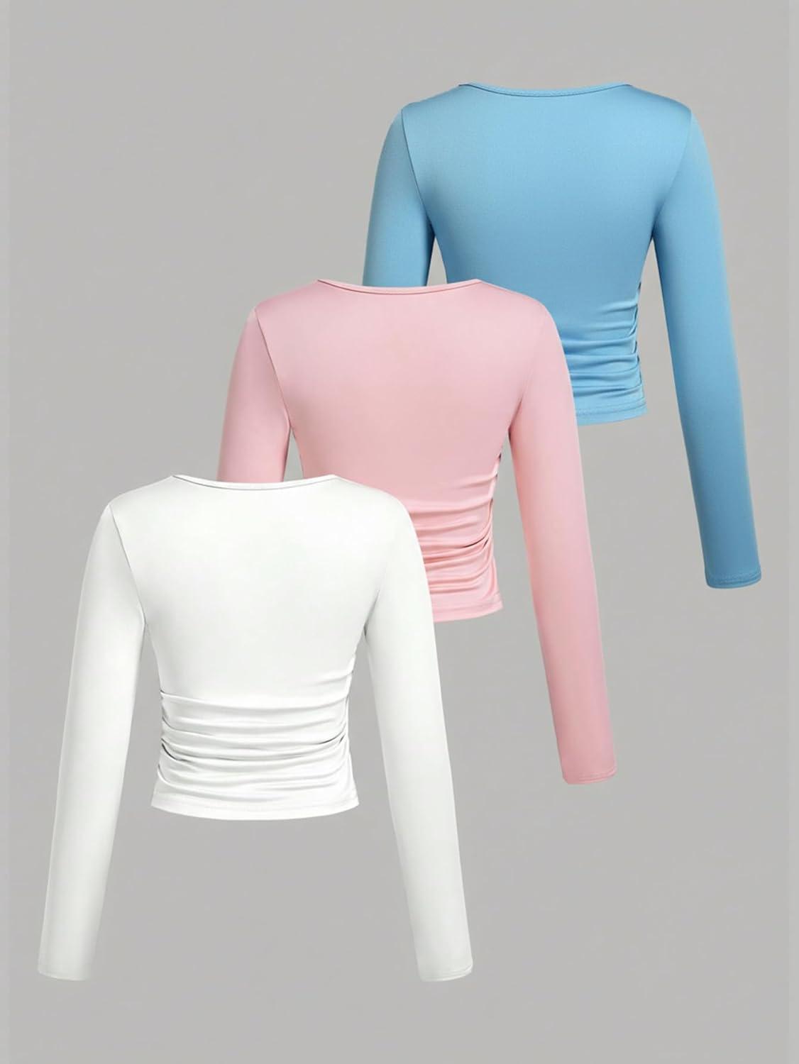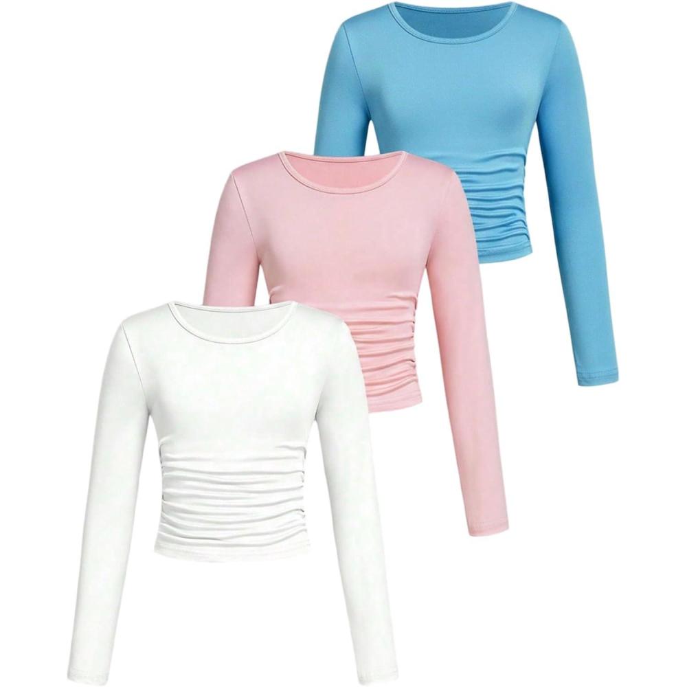 SOLY HUX Girl’s 3 Piece T Shirt Crew Neck Long Sleeve Ruched Crop Tops Slim Fit Solid Basic Tee(White Blue and Pink)