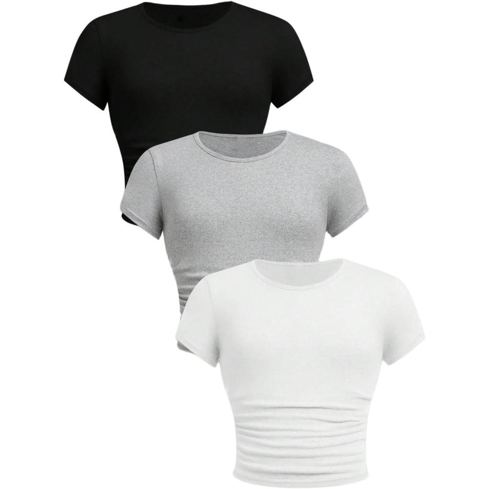 SOLY HUX Girl’s Basic T-Shirts Set Crew Neck Short Sleeve Crop Top 3 Packs Summer Fitted Tees(Black Grey White)