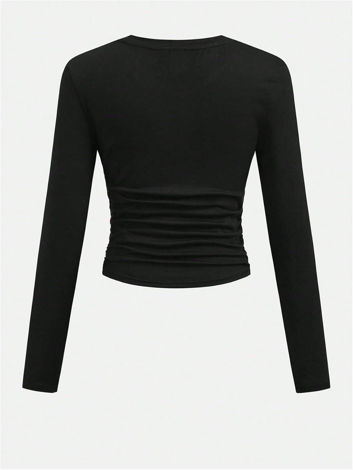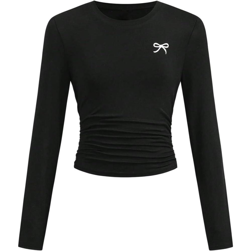SOLY HUX Girl’s Bow Graphic Tees Y2k Ruched Long Sleeve Crew Neck T Shirt Cute Fall Tops(Black Bow)