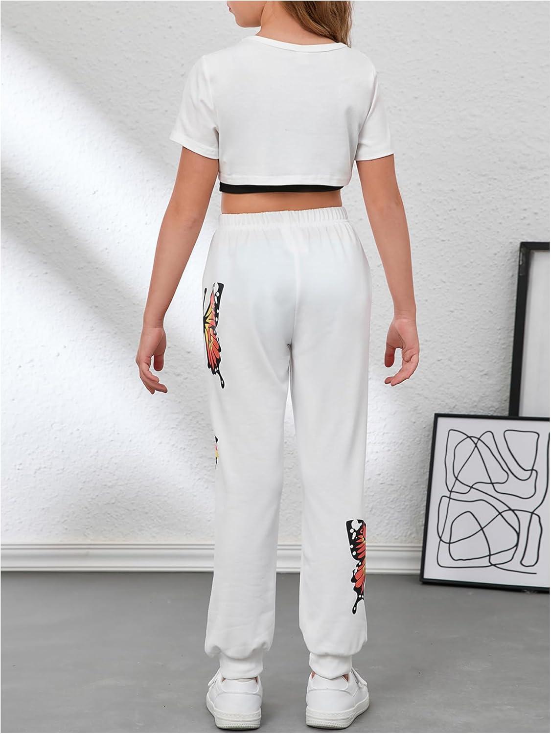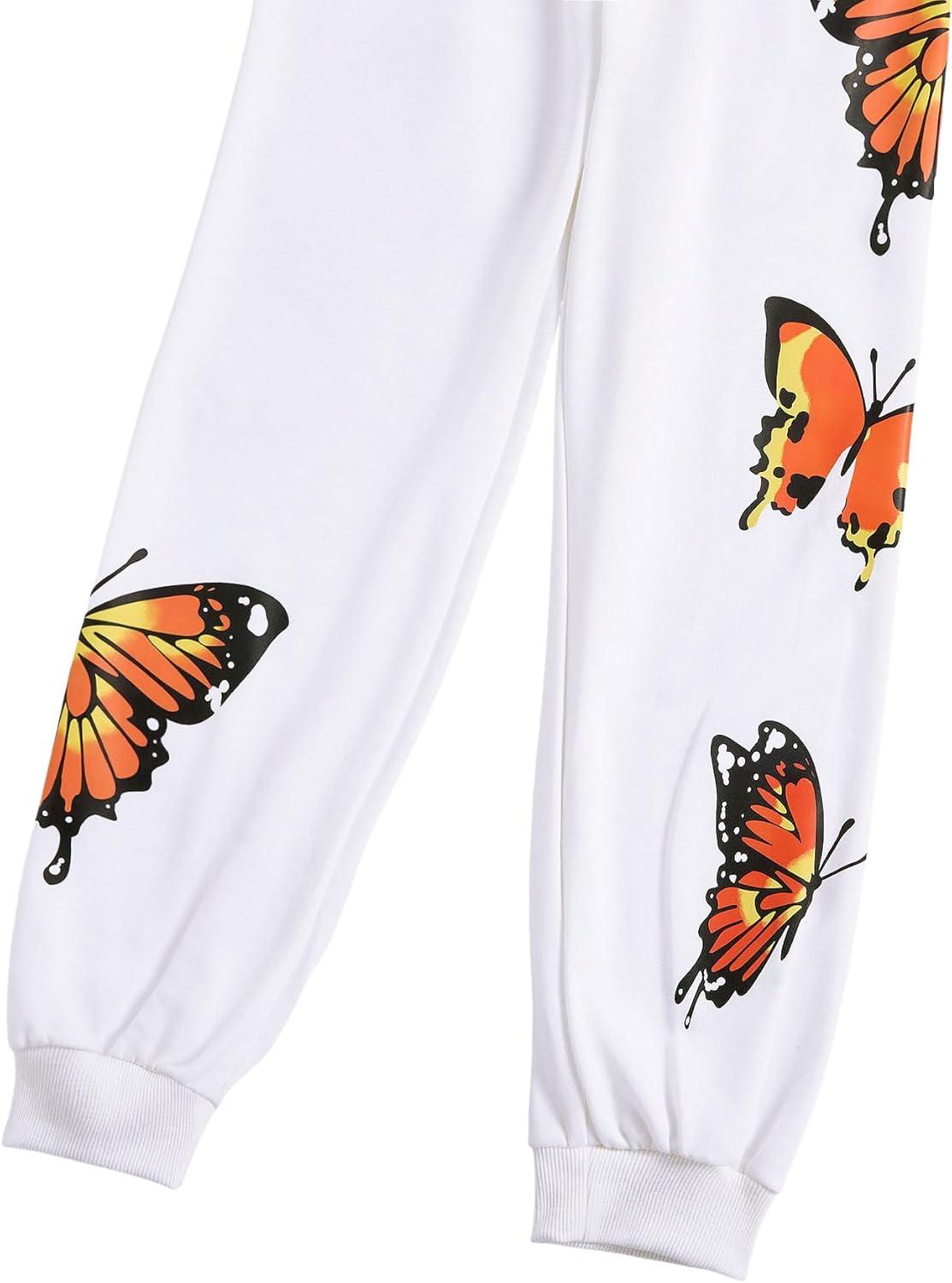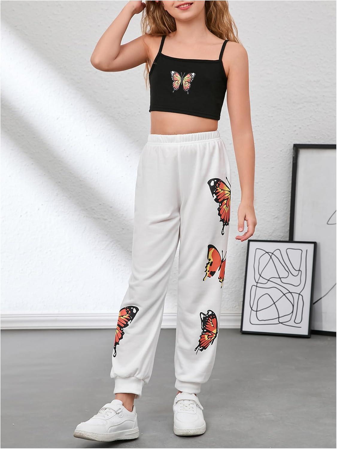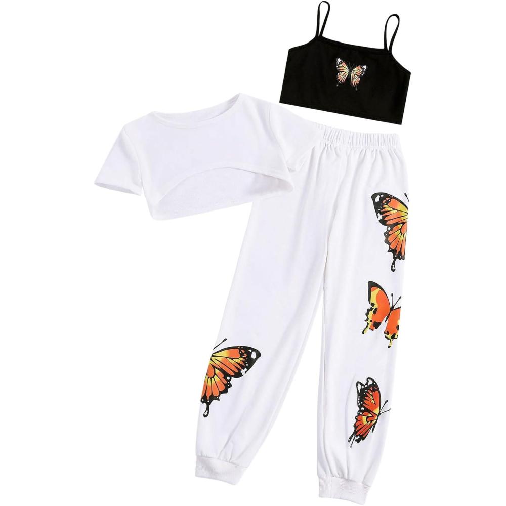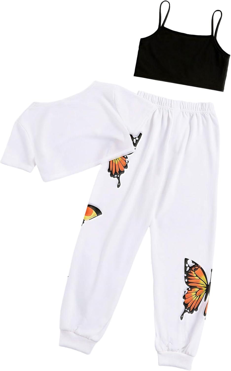 SOLY HUX Girl’s Butterfly Print Cami Tops & High Low Hem Short Sleeve T Shirt with Sweatpants 3 Piece(White Butterfly – Thickening Type)
