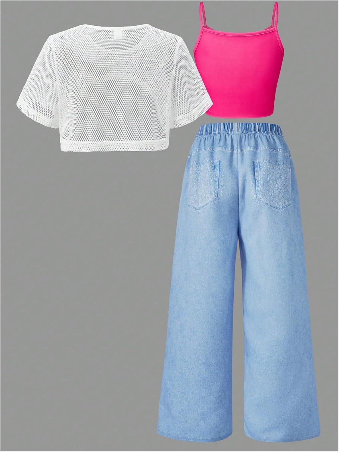SOLY HUX Girl’s Graphic 3 Piece Outfits Sheer Crop Tee and Cami Top with Jeans Pants Set(White Hot Pink)