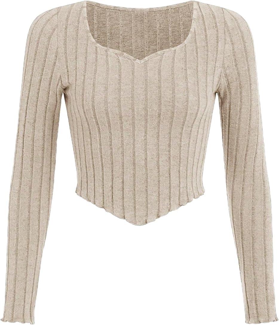 SOLY HUX Girl’s Long Sleeve Cute Crop Tops Sweetheart Neck Asymmetrical Tight T Shirts Fitted Tees(Pure Apricot)