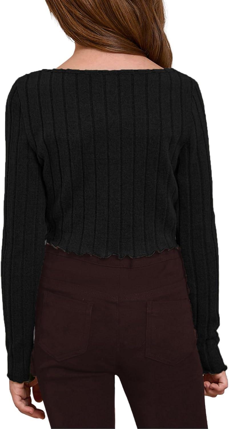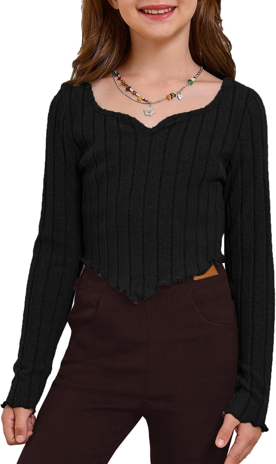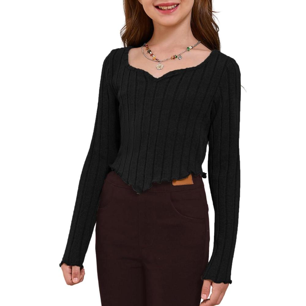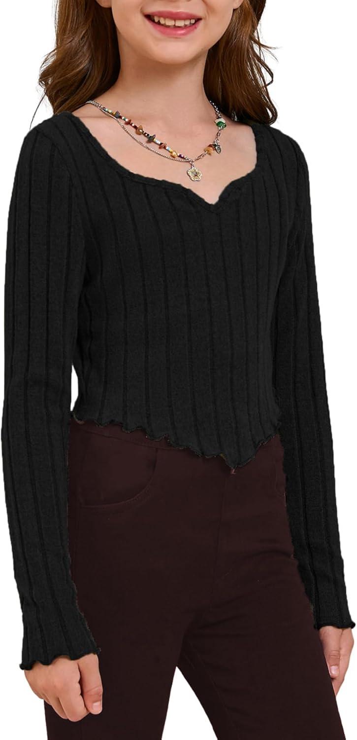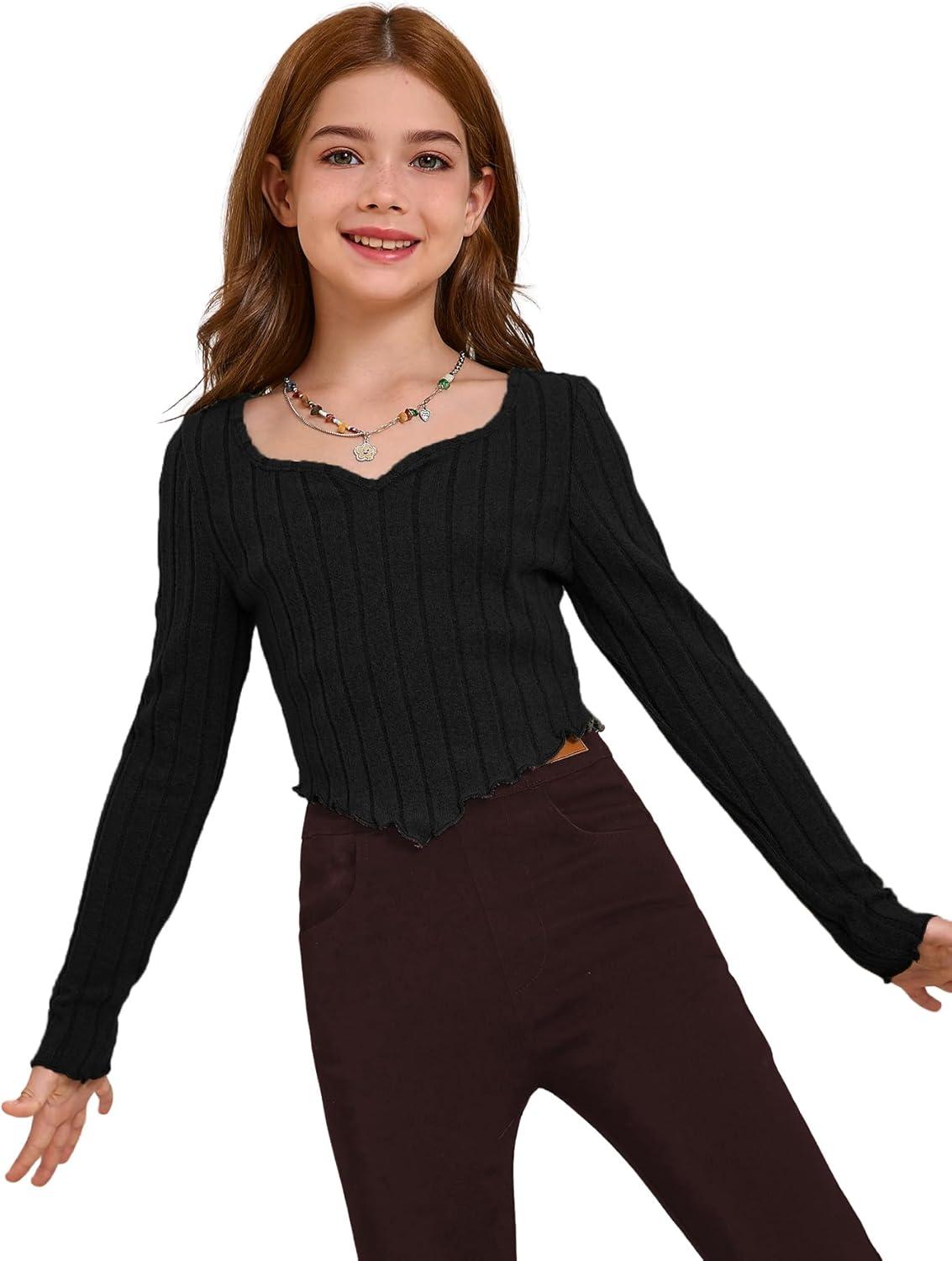 SOLY HUX Girl’s Long Sleeve Cute Crop Tops Sweetheart Neck Asymmetrical Tight T Shirts Fitted Tees(Pure Black)