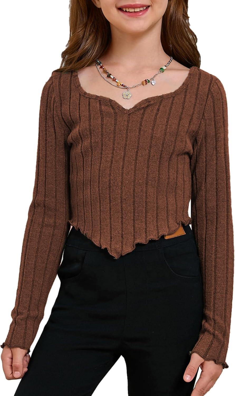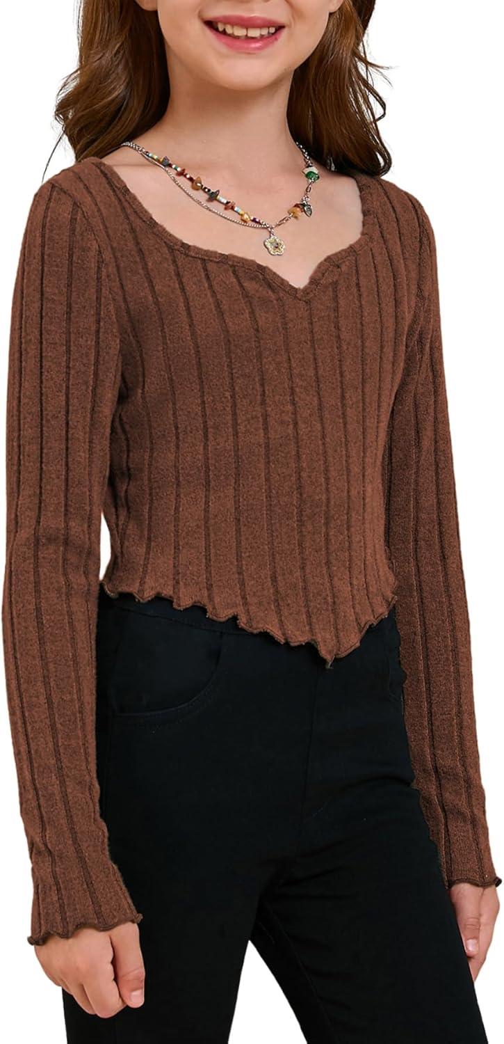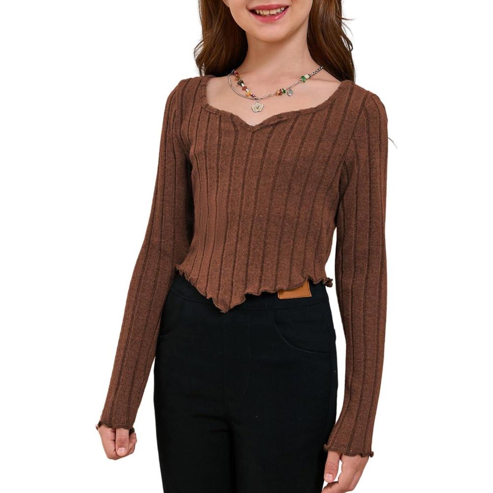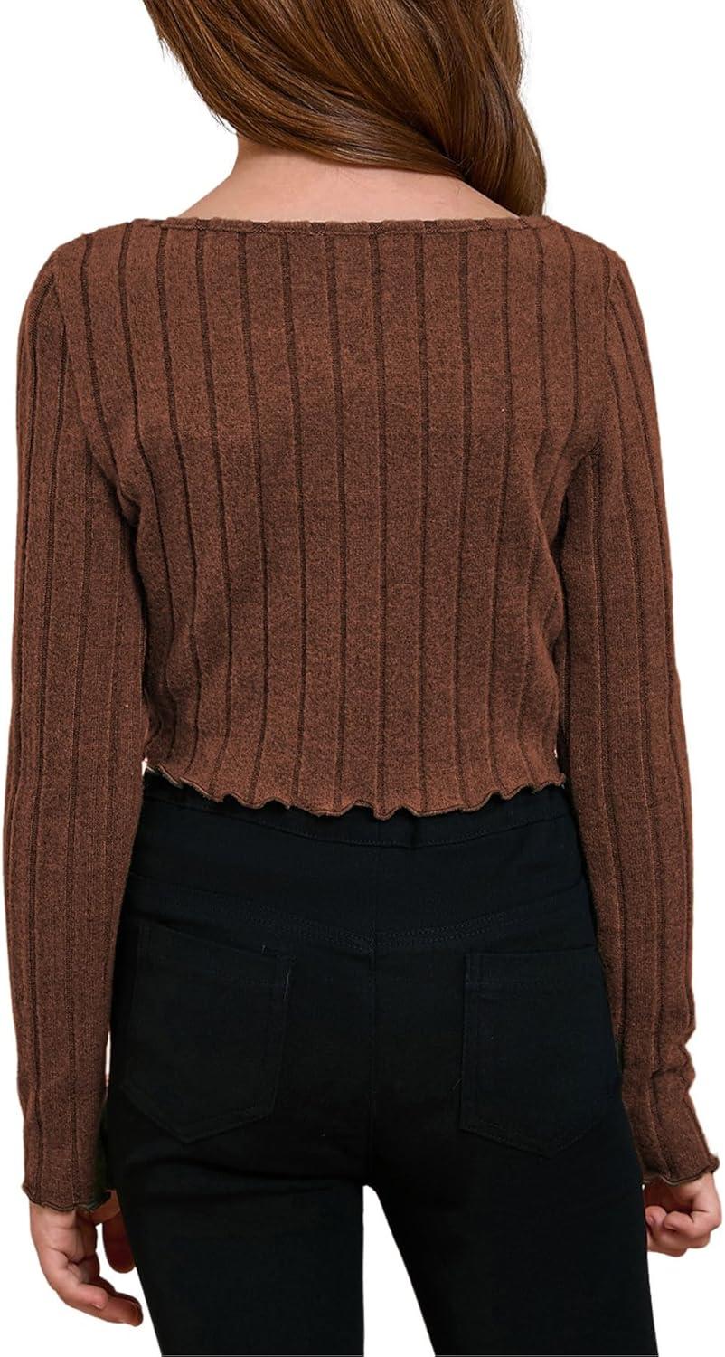 SOLY HUX Girl’s Long Sleeve Cute Crop Tops Sweetheart Neck Asymmetrical Tight T Shirts Fitted Tees(Pure Brown)