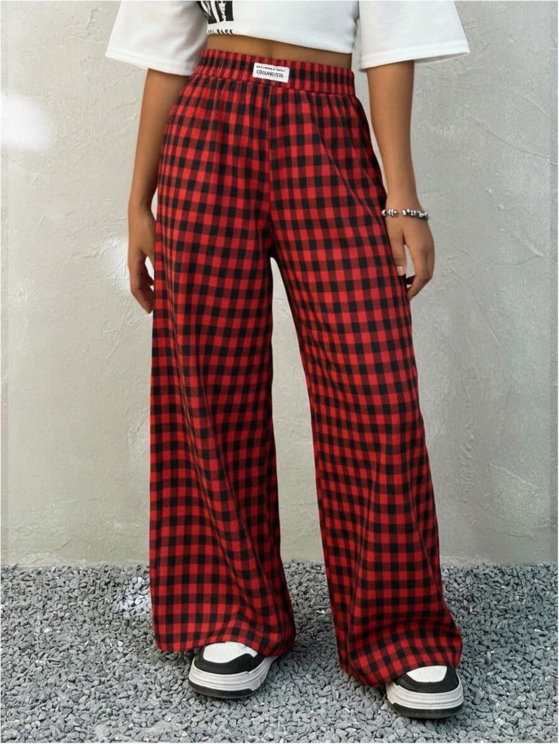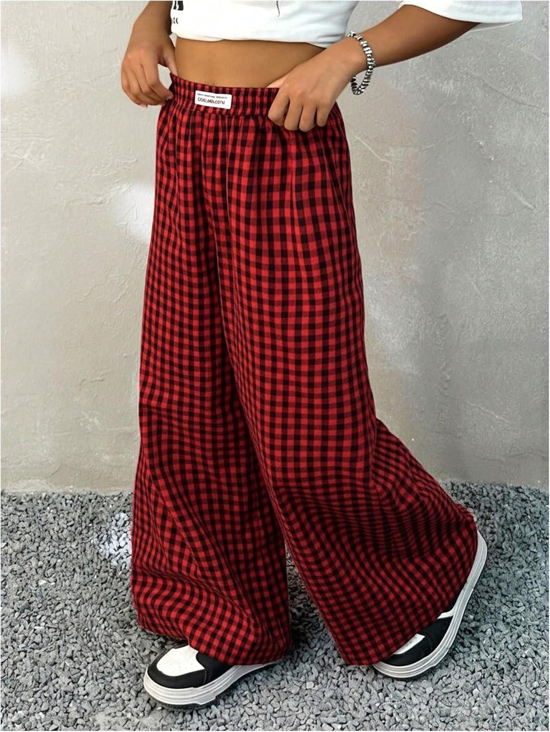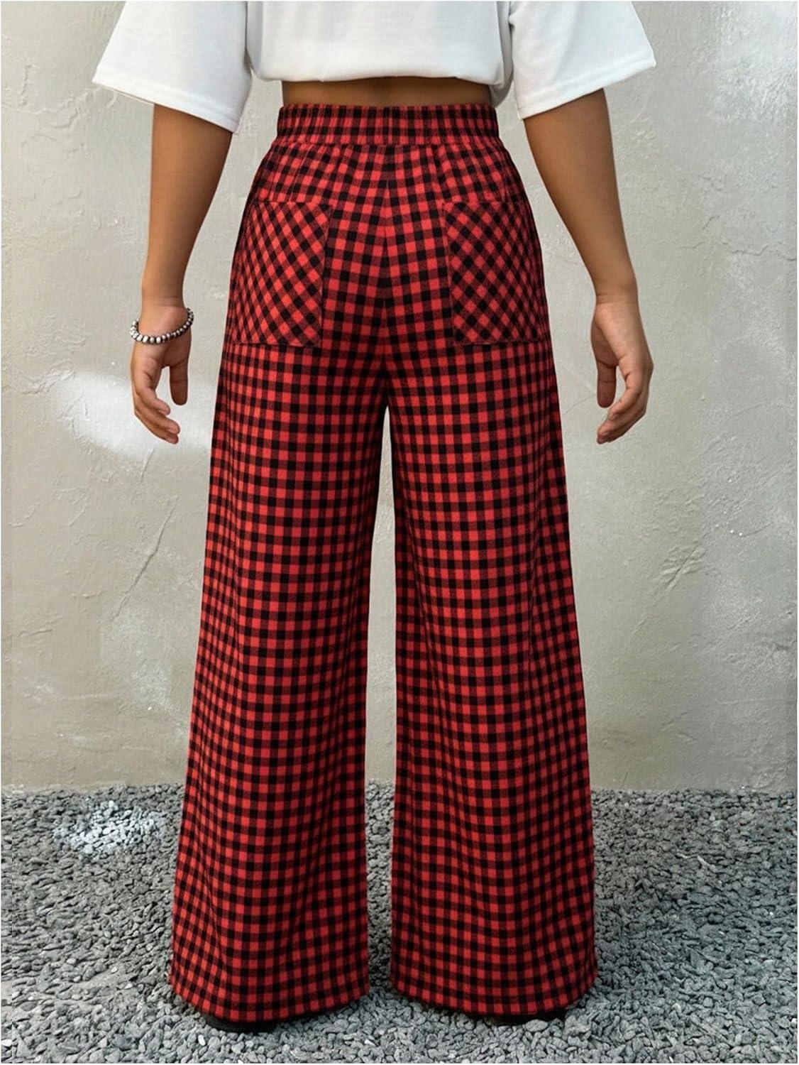 SOLY HUX Girl’s Plaid Gingham Baggy Pants Elastic High Waisted Wide Leg Long Pants Trousers(Red Plaid)