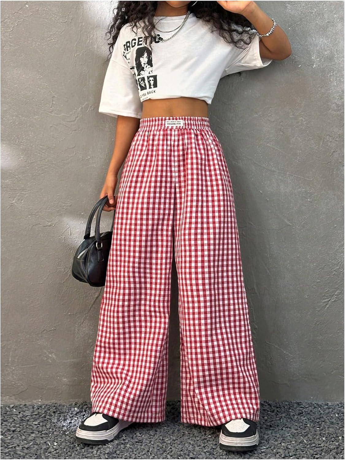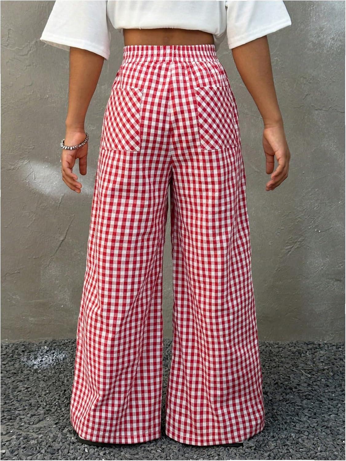 SOLY HUX Girl’s Plaid Gingham Baggy Pants Elastic High Waisted Wide Leg Long Pants Trousers(Red Plaid)