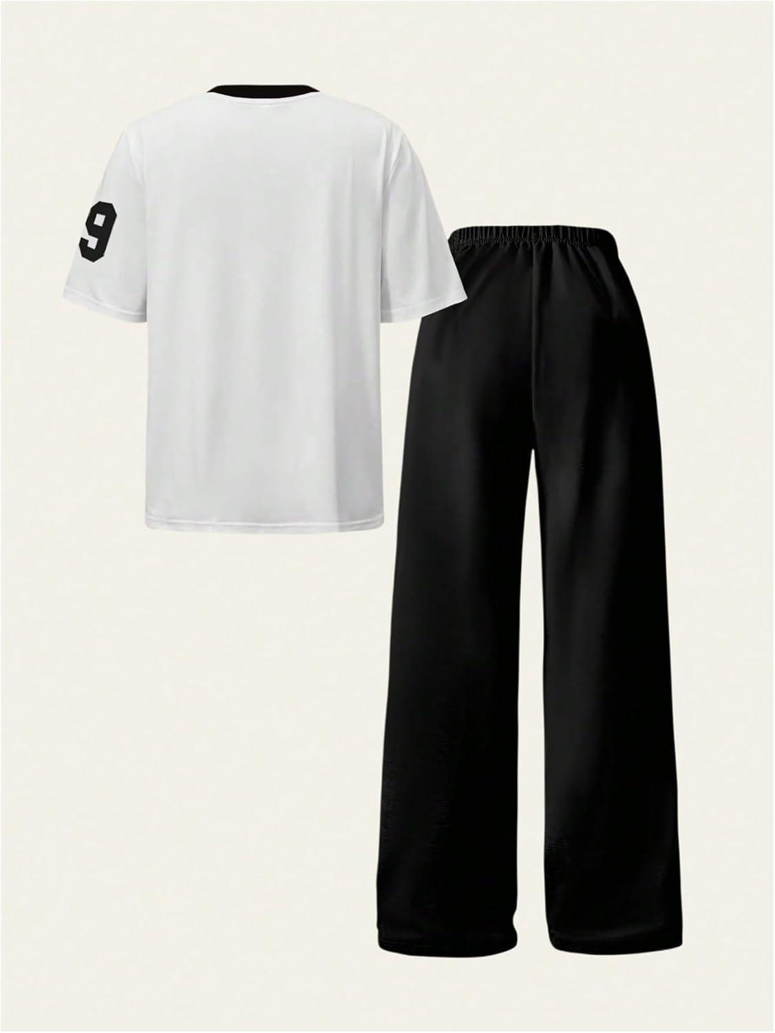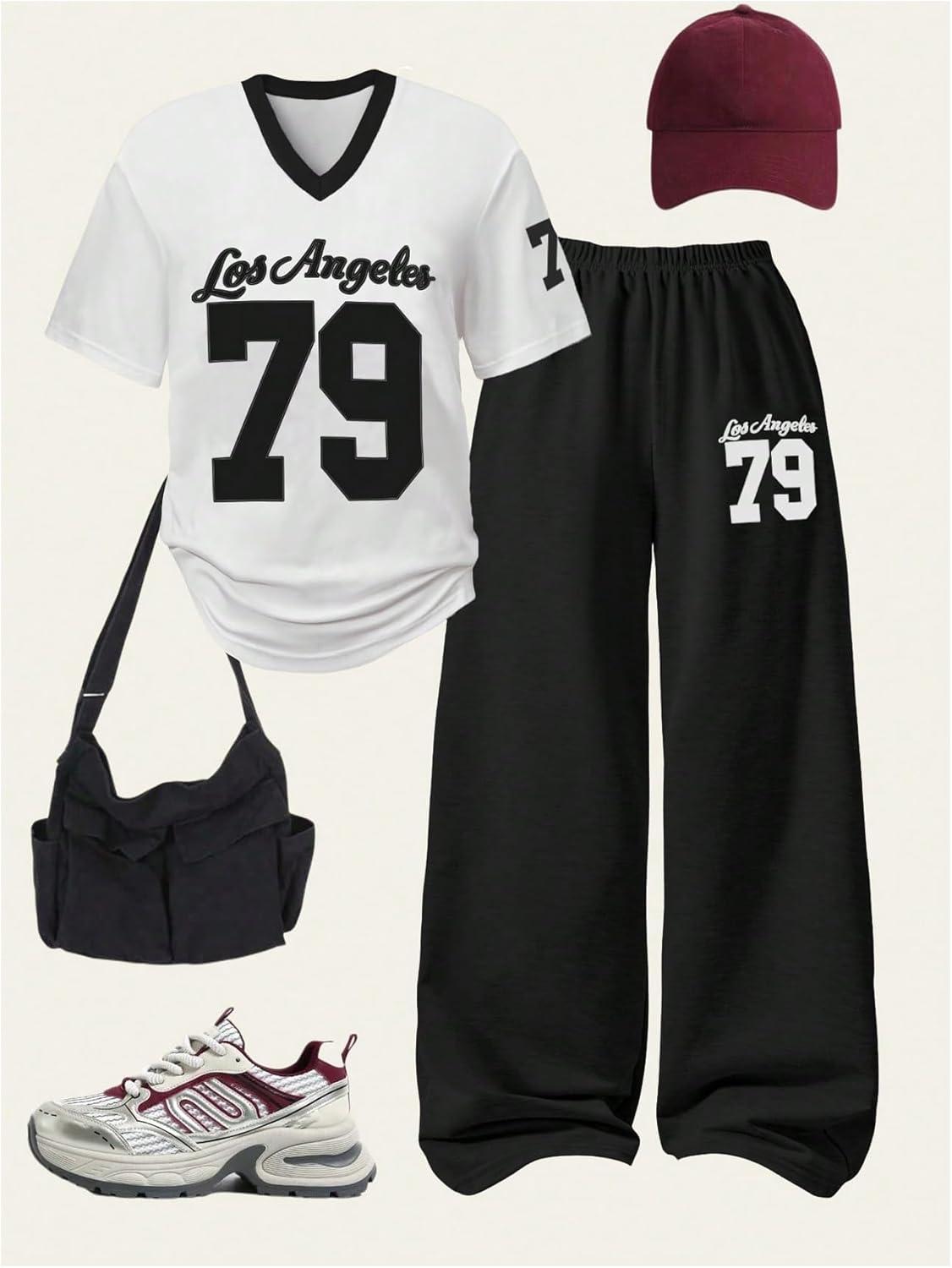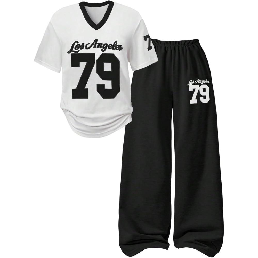 imageSOLY HUX Girls Sporty Outfits Number Graphic Jersey Shirt and Baggy Sweatpants Suit 2 Piece SetBlack White Letter
