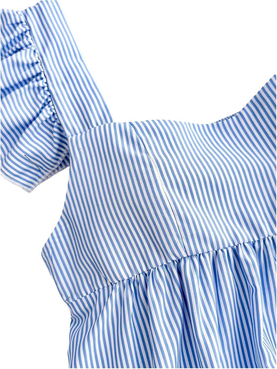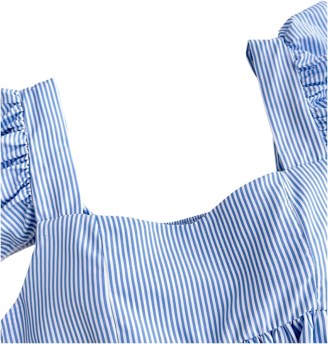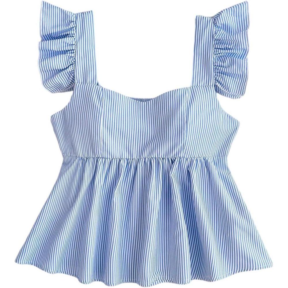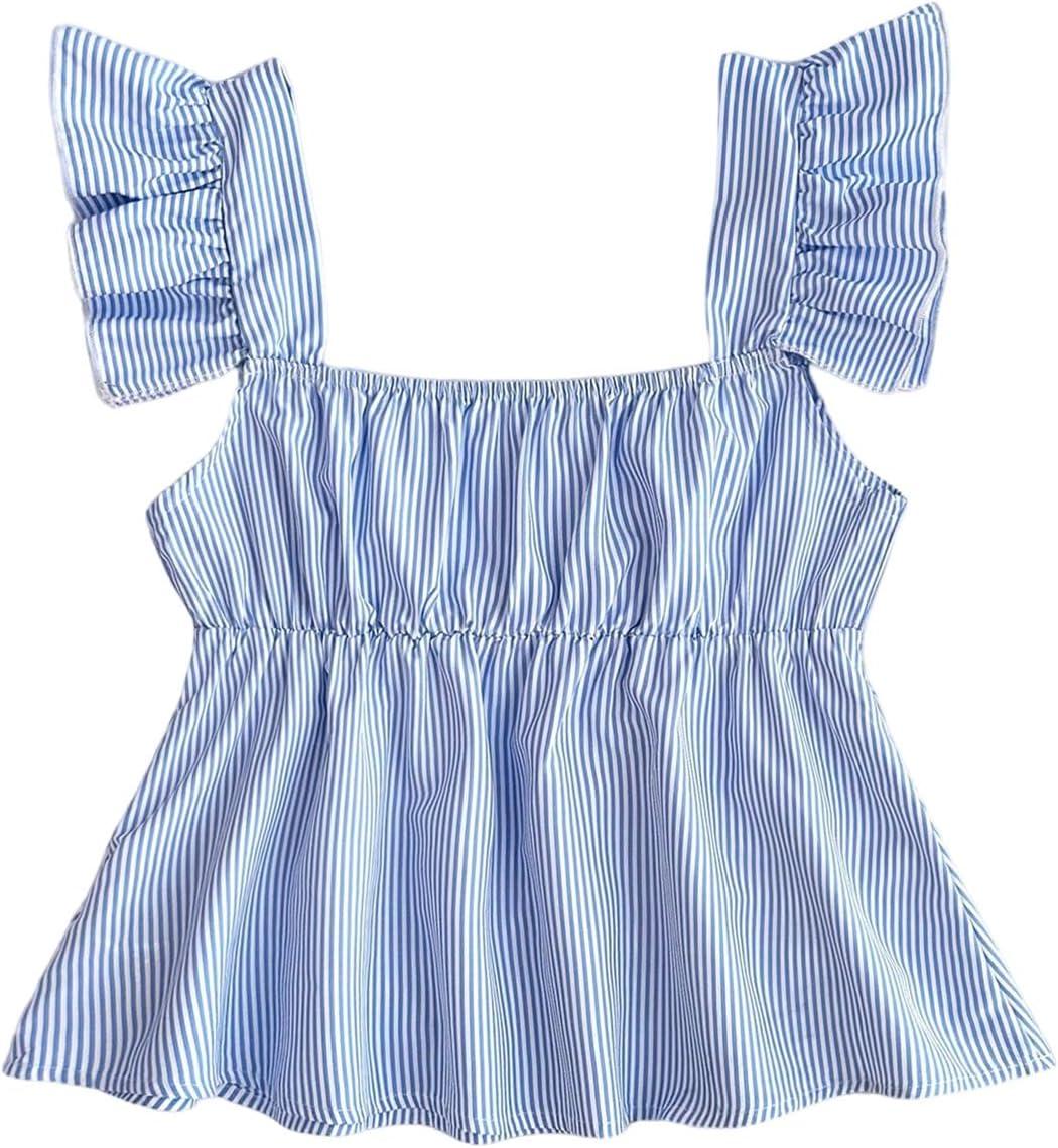 SOLY HUX Girl’s Summer Floral Print Ruffle Cap Sleeve Sweetheart Neck Tops Peplum Cute Babydoll Blouse(Blue and White Striped)