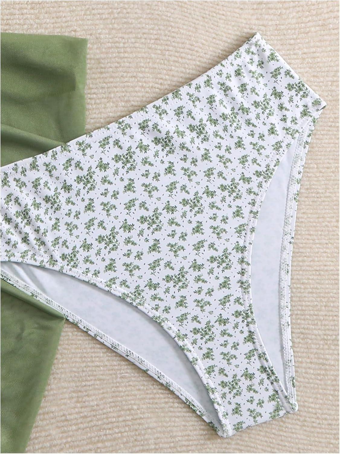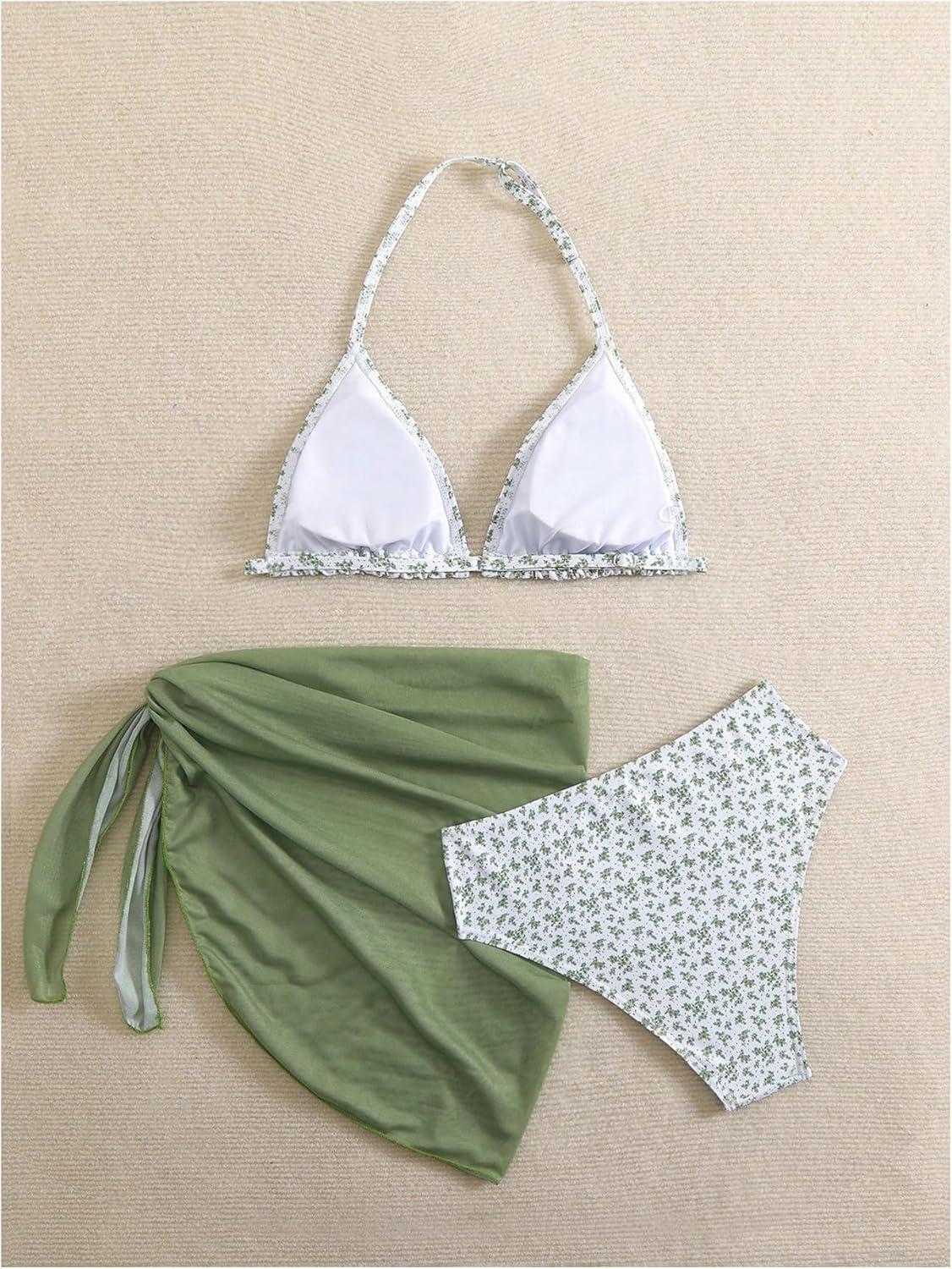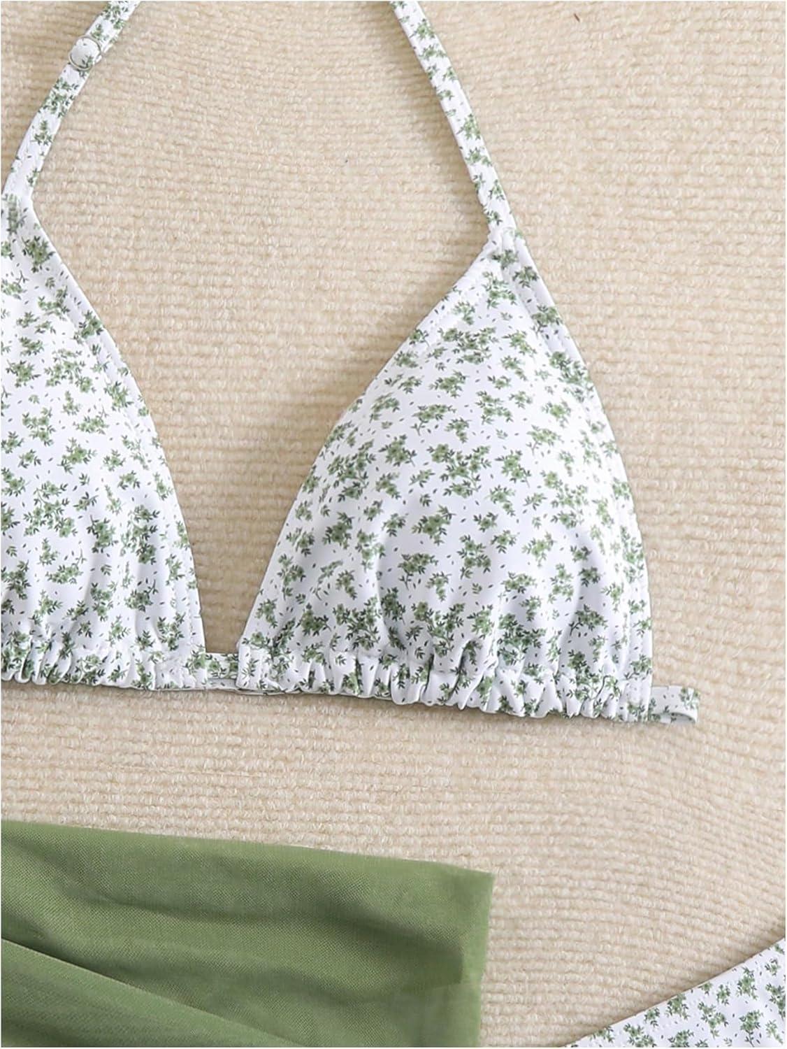 SOLY HUX Girl’s Summer Swimsuit Set Floral Halter Triangle Bikini Set with Wrap Skirts Beachwear(Green and White)