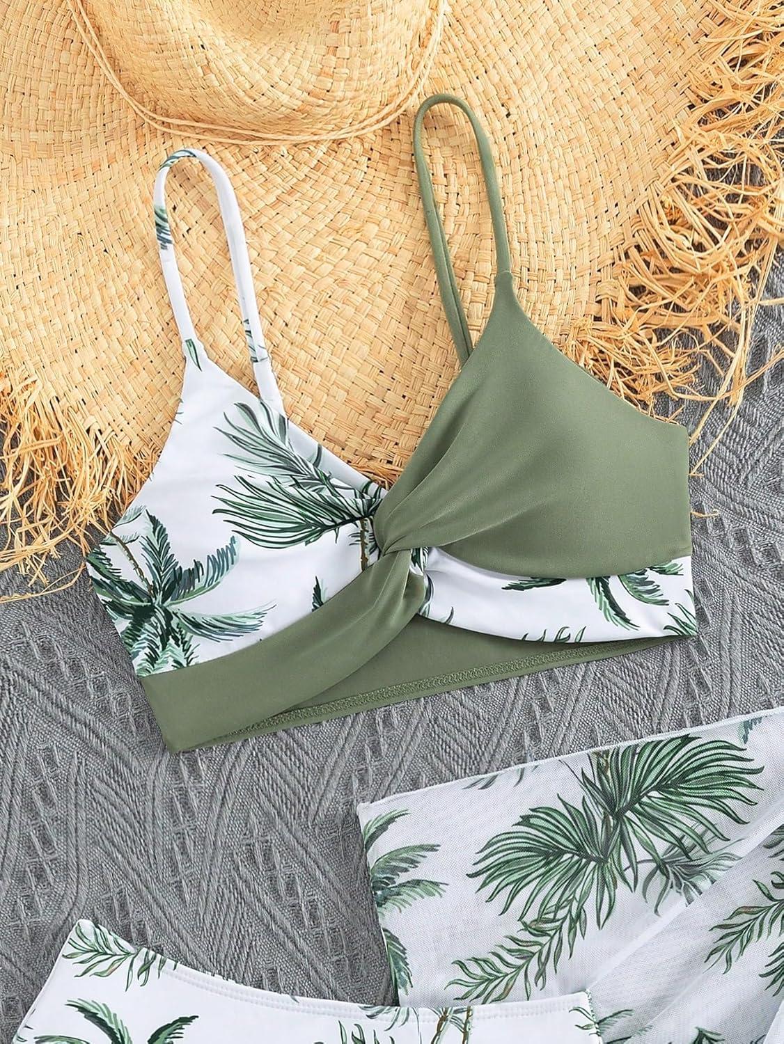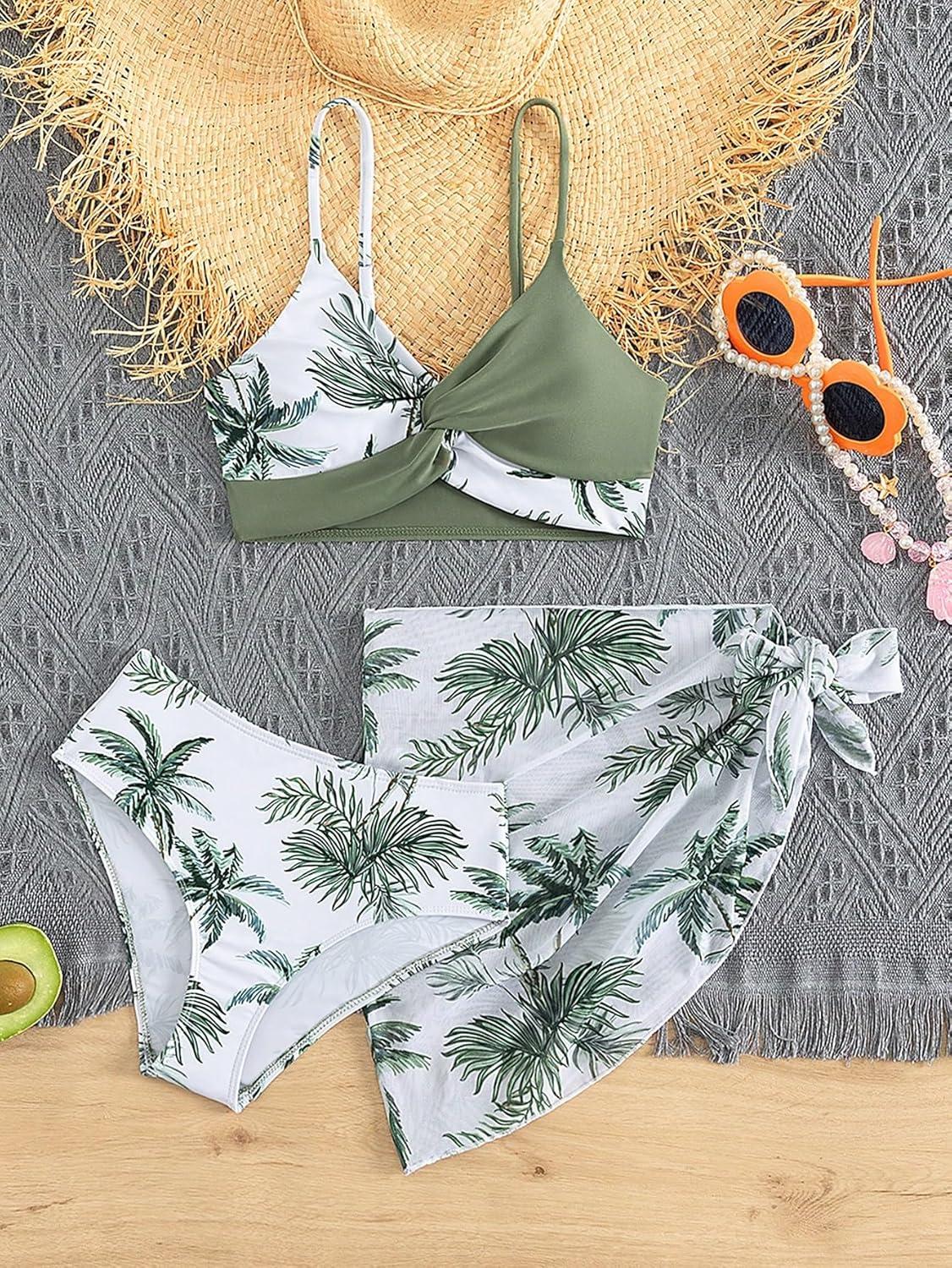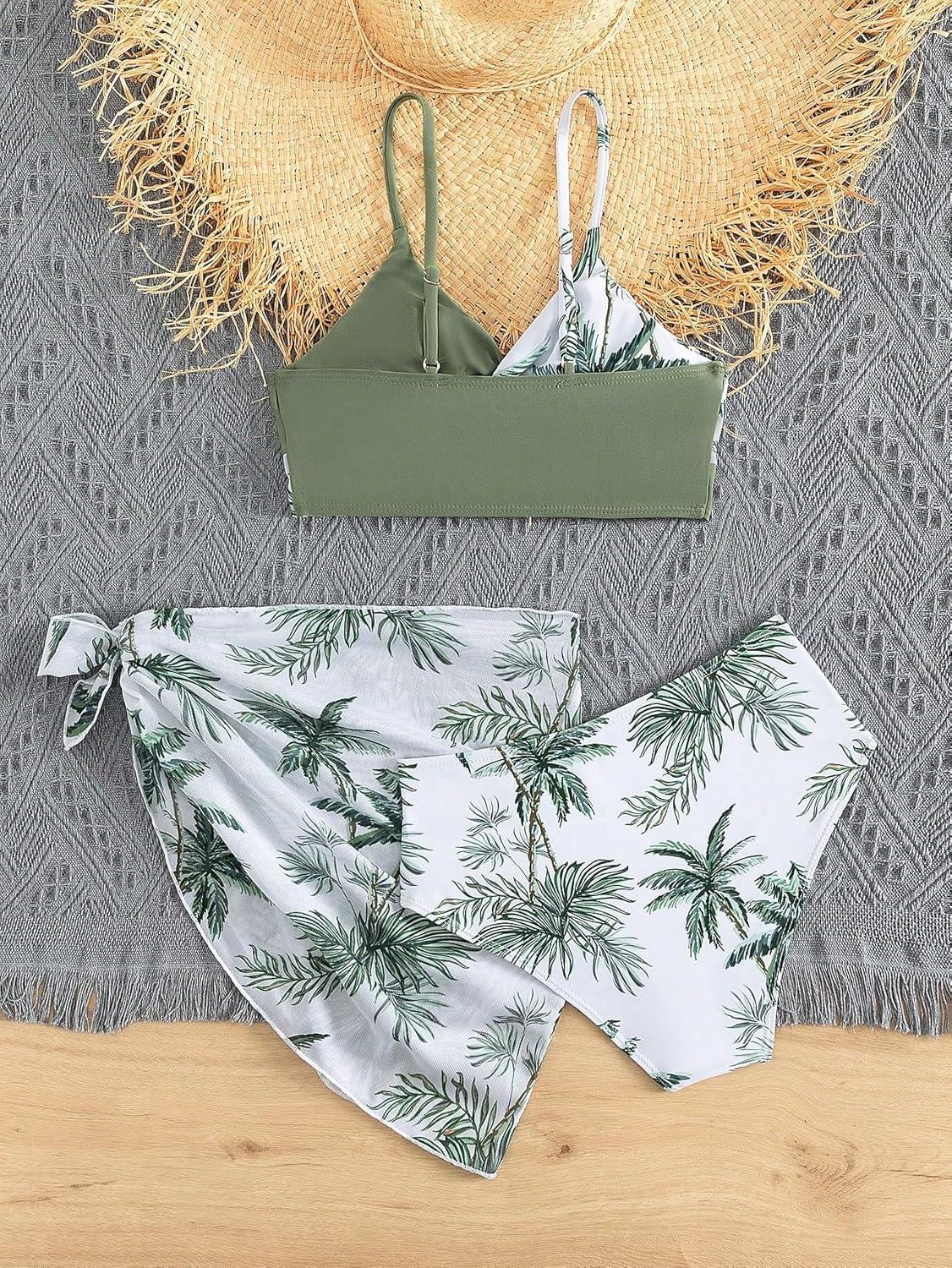 SOLY HUX Girl’s Summer Swimsuit Set Floral Halter Triangle Bikini Set with Wrap Skirts Beachwear(Green Tropical)