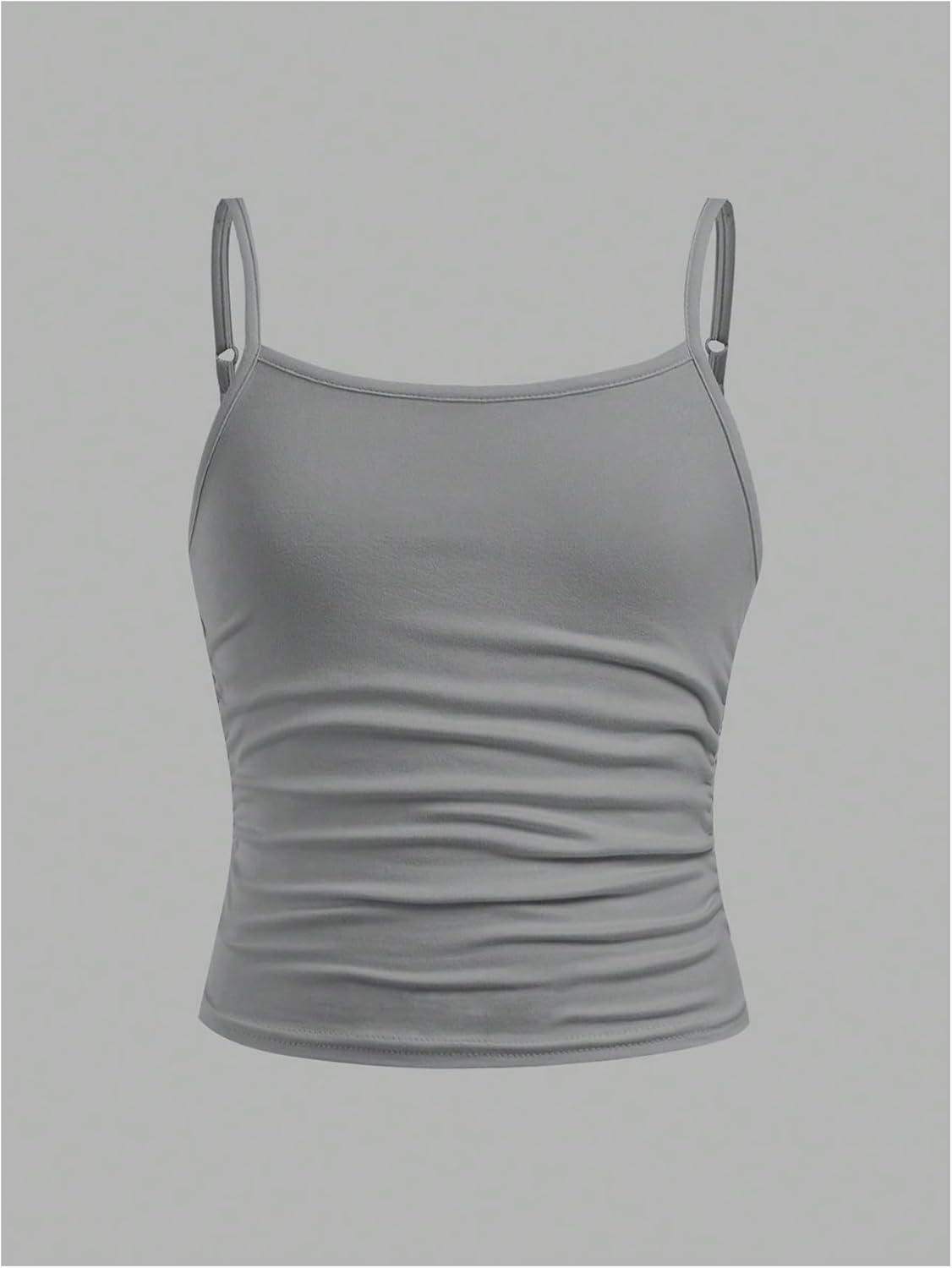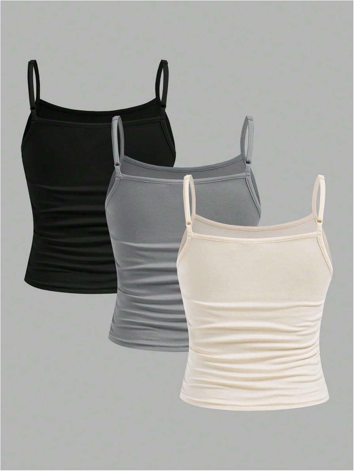 SOLY HUX Girl’s Tank Tops 3 Packs Cute Ruched Spaghetti Strap Camisole Slim Fit Undershirts(Beige Grey Black)