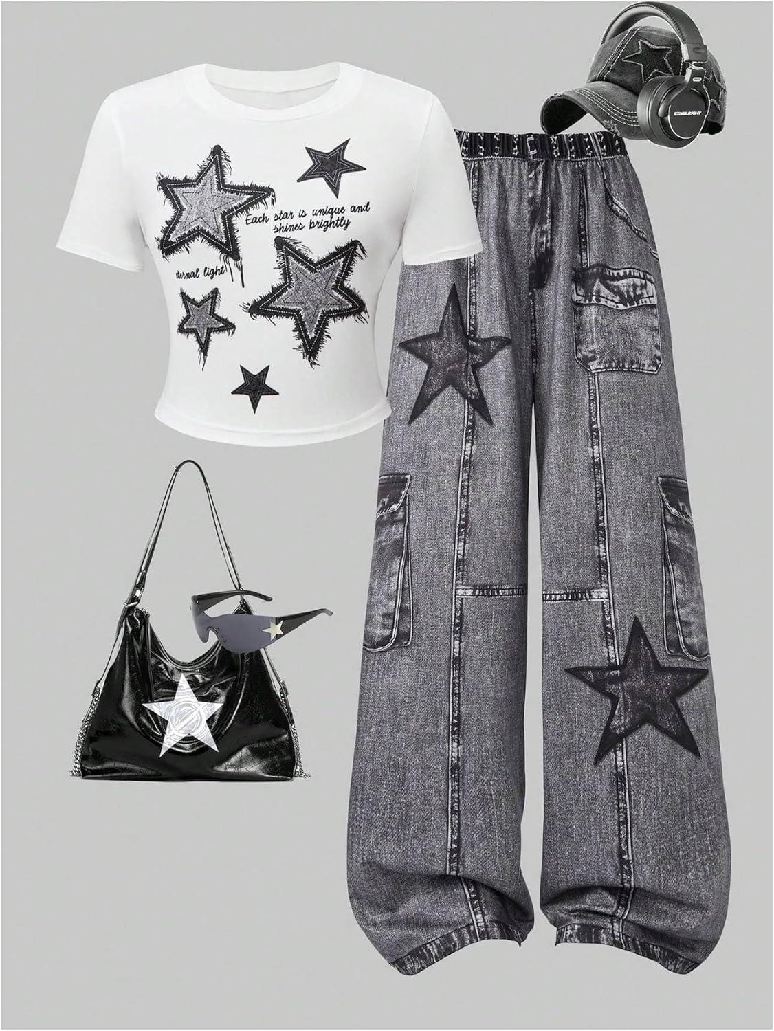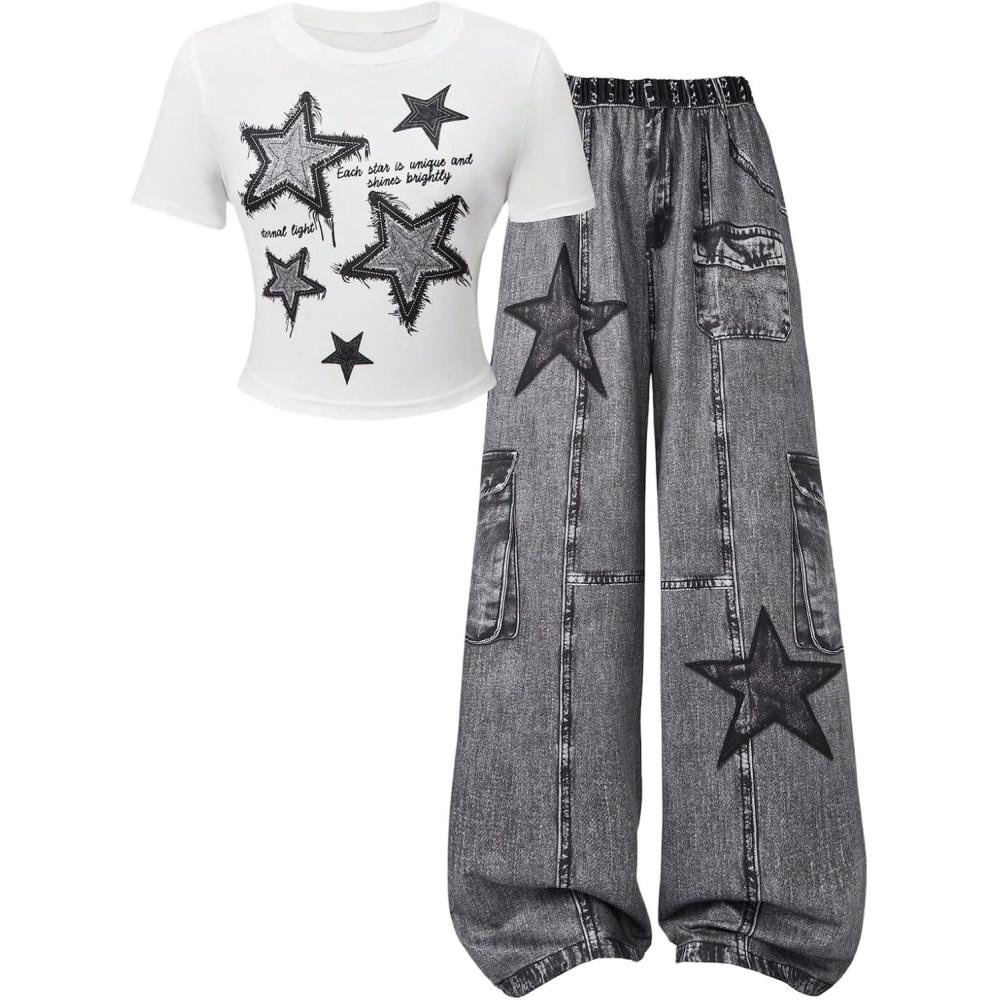 SOLY HUX Girl’s Y2k Clothes Star Graphic Crop Top and Baggy Pants Grunge 2 Piece Outfit Streetwear(Black and White)