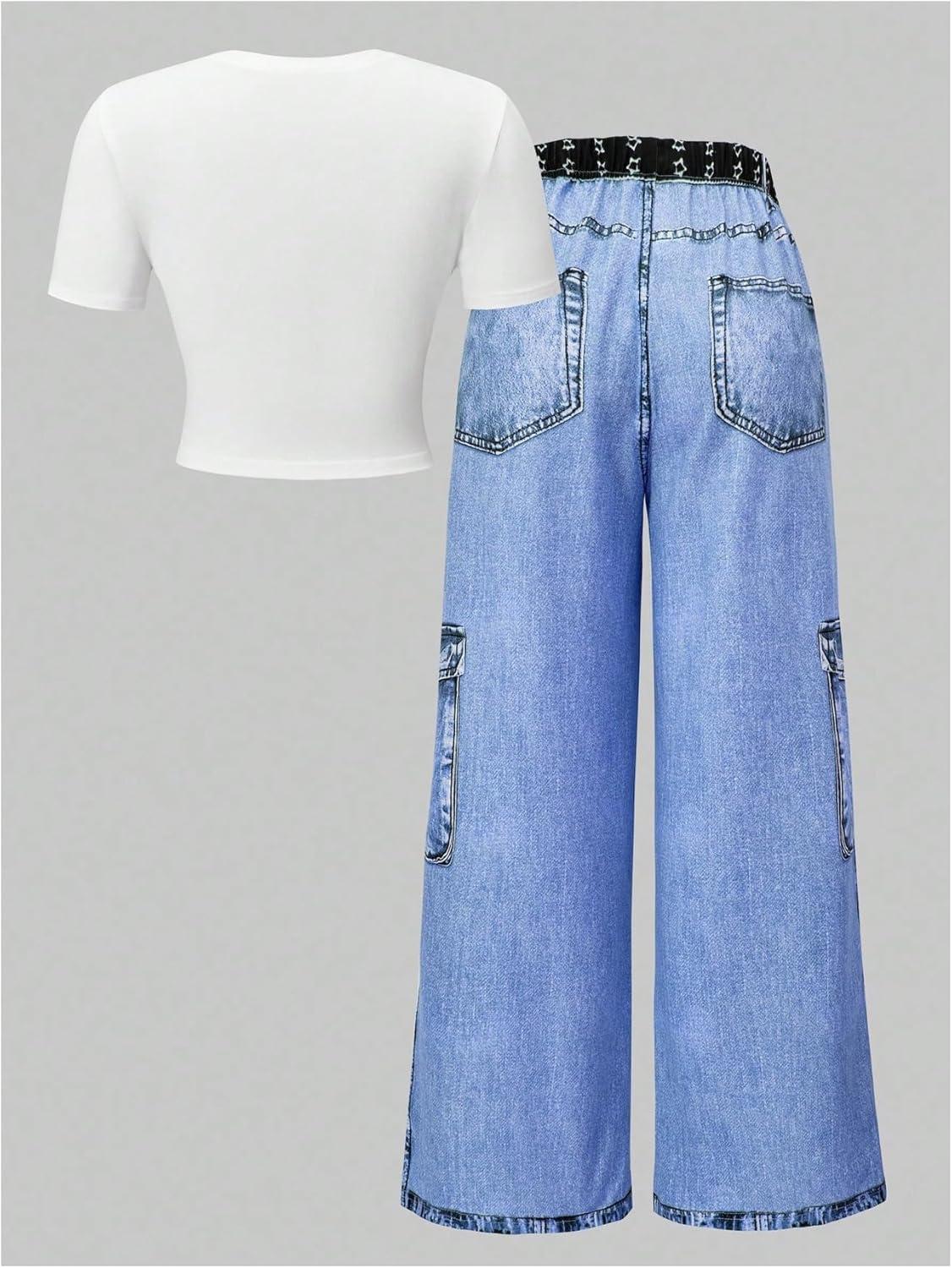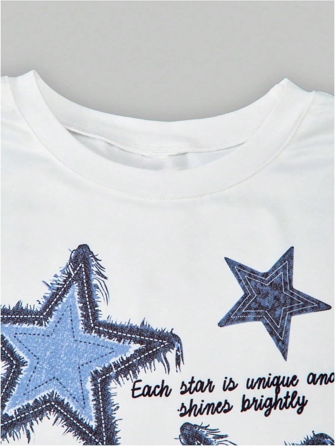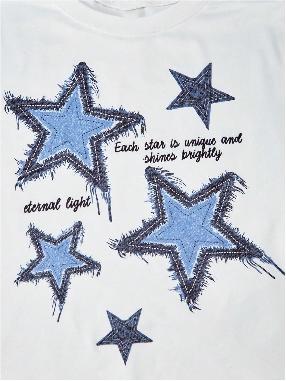 SOLY HUX Girl’s Y2k Clothes Star Graphic Crop Top and Baggy Pants Grunge 2 Piece Outfit Streetwear(White Dark Blue Star)