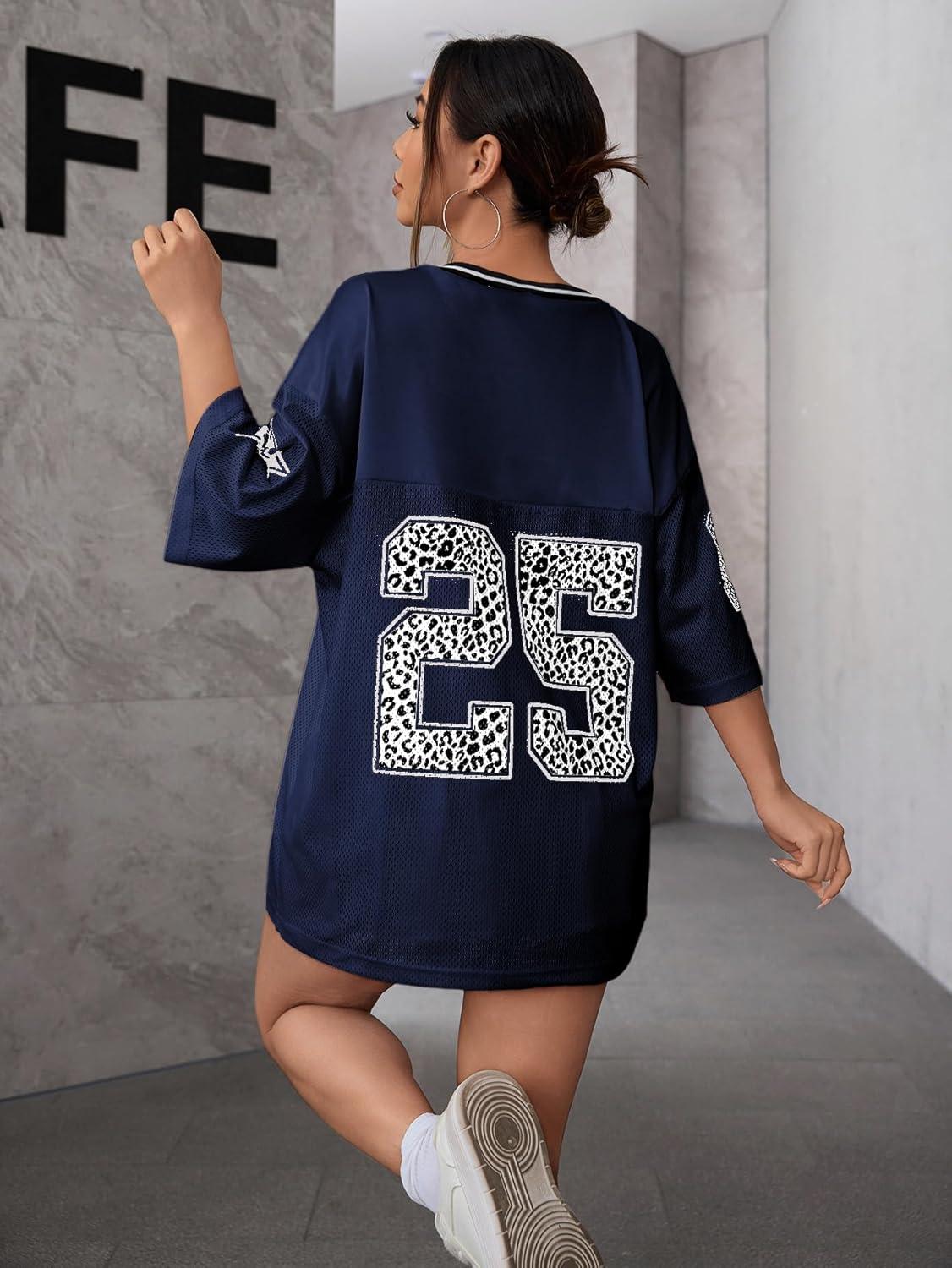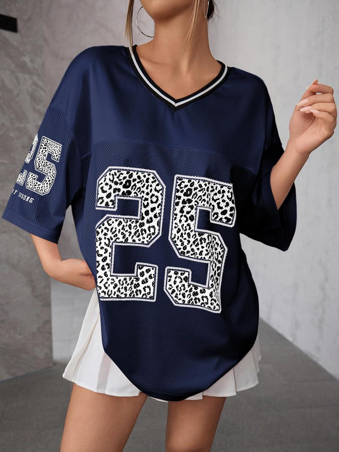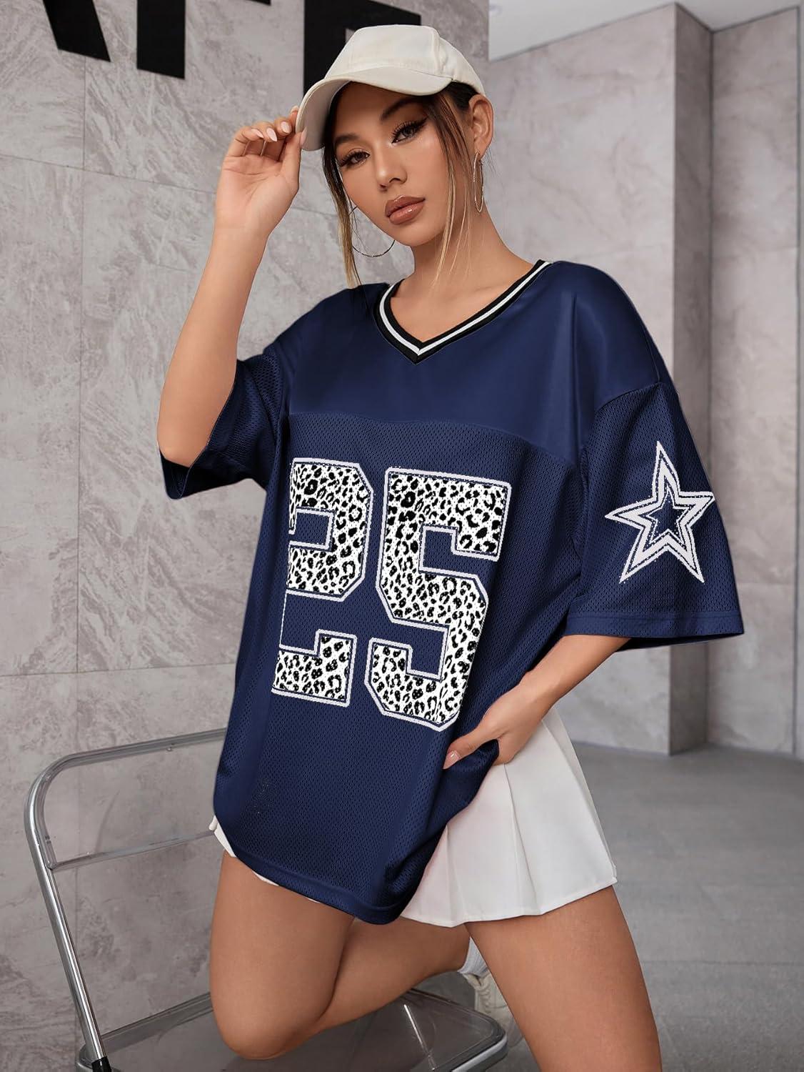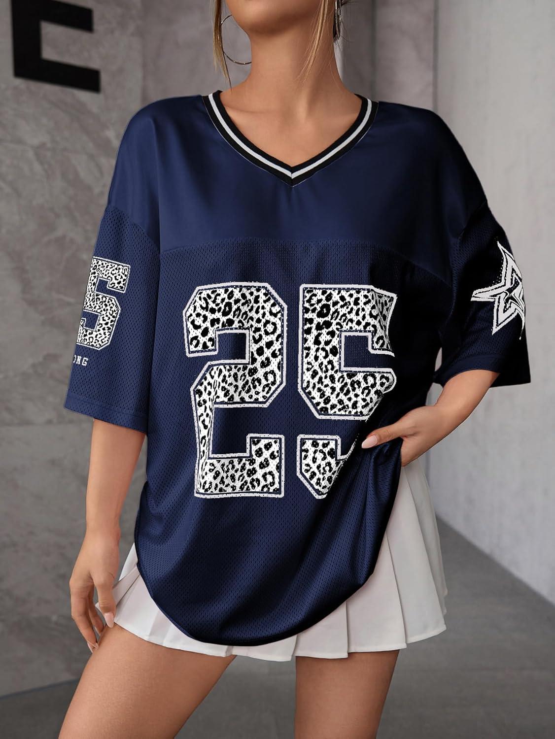 SOLY HUX Jersey Shirts for Women Y2k Graphic Number Oversized Tees V Neck Half Sleeve Cute Soccer Streetwear T Shirt Tops(Dark Blue Number)