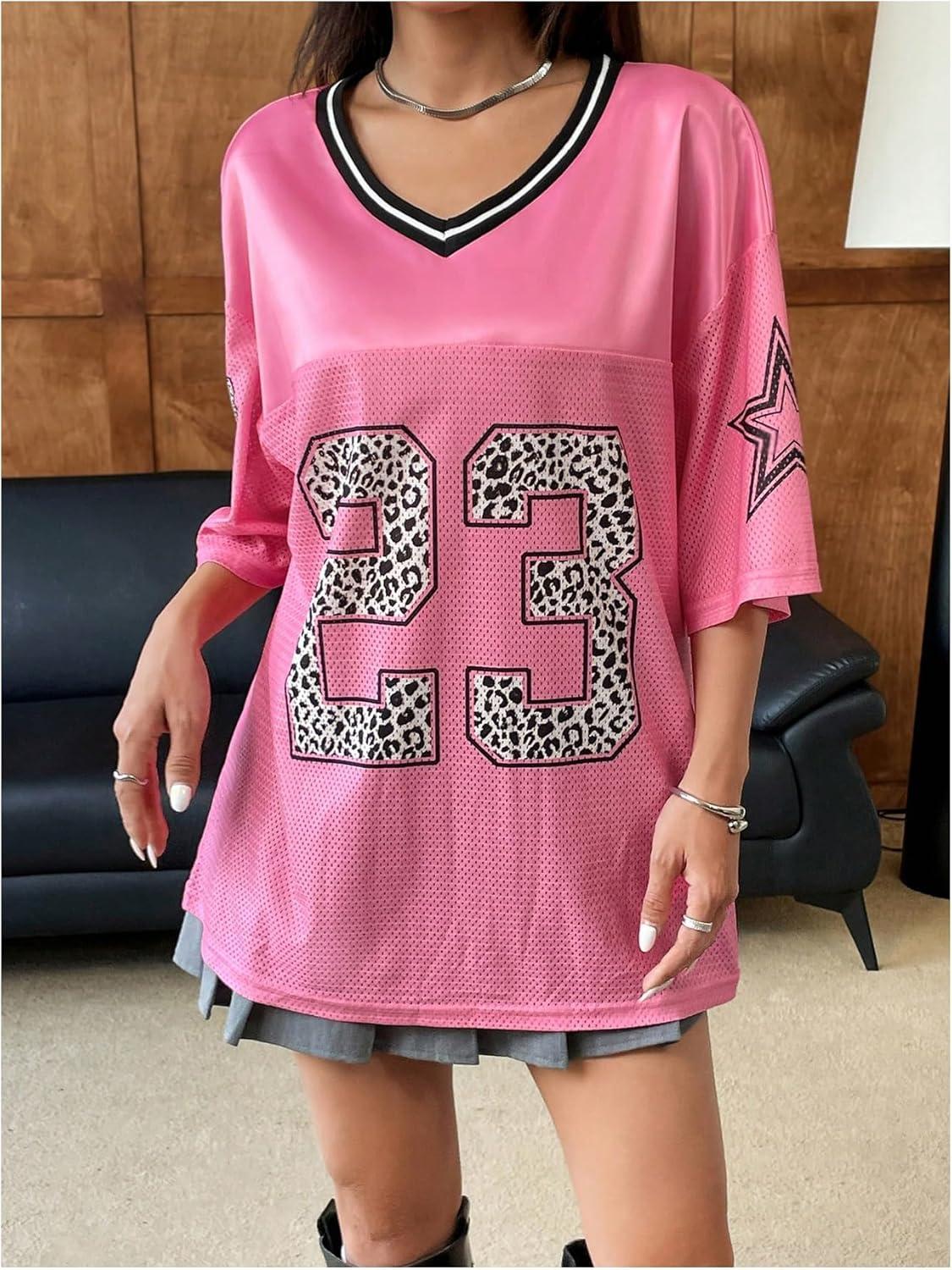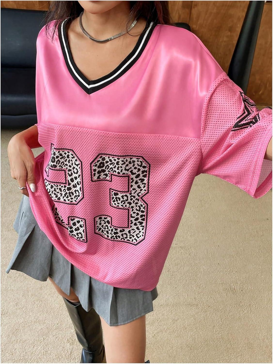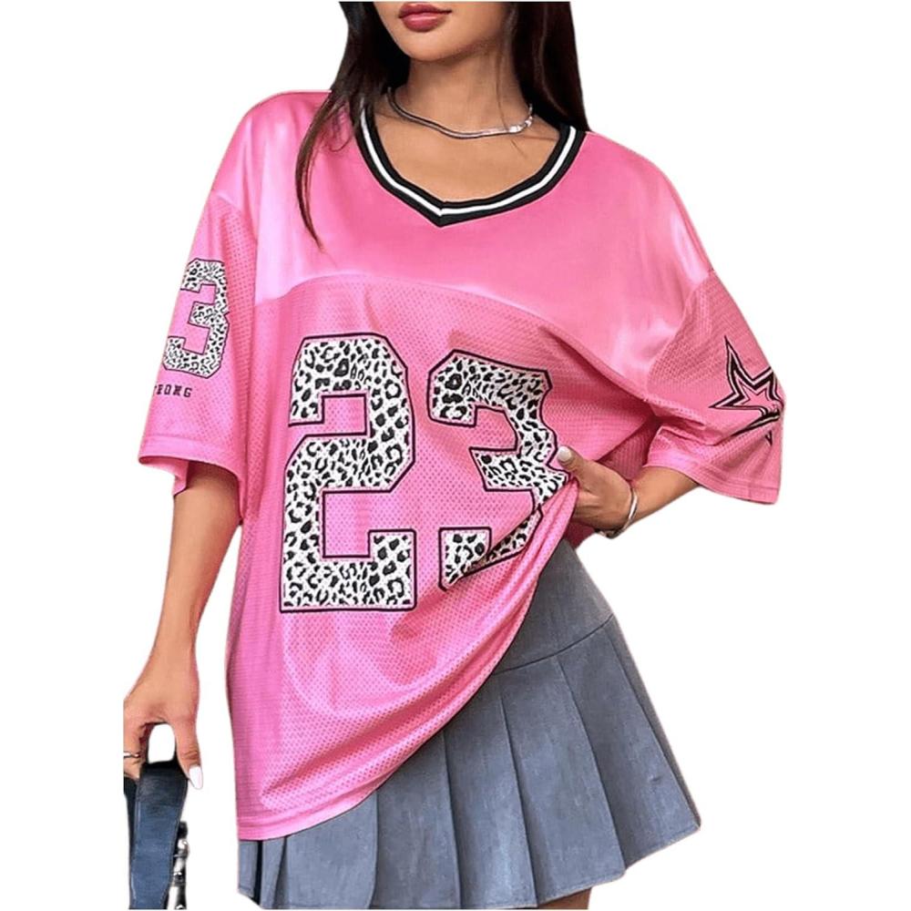 SOLY HUX Jersey Shirts for Women Y2k Graphic Number Oversized Tees V Neck Half Sleeve Cute Soccer Streetwear T Shirt Tops(Pink Letter Number)