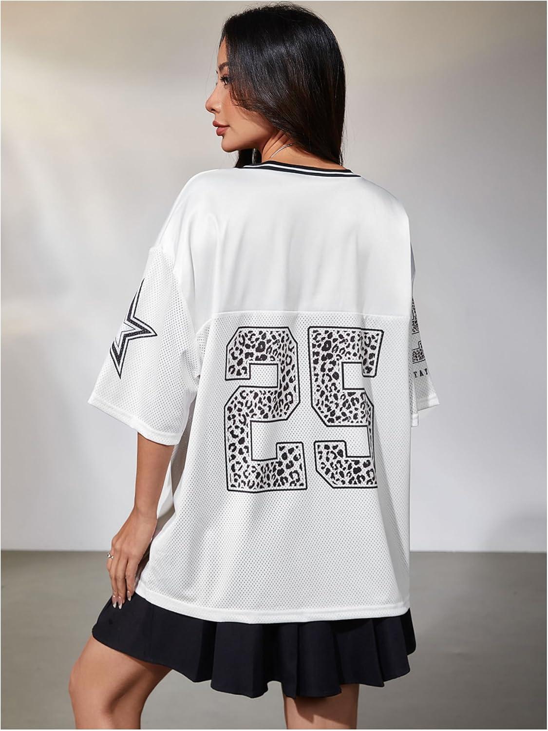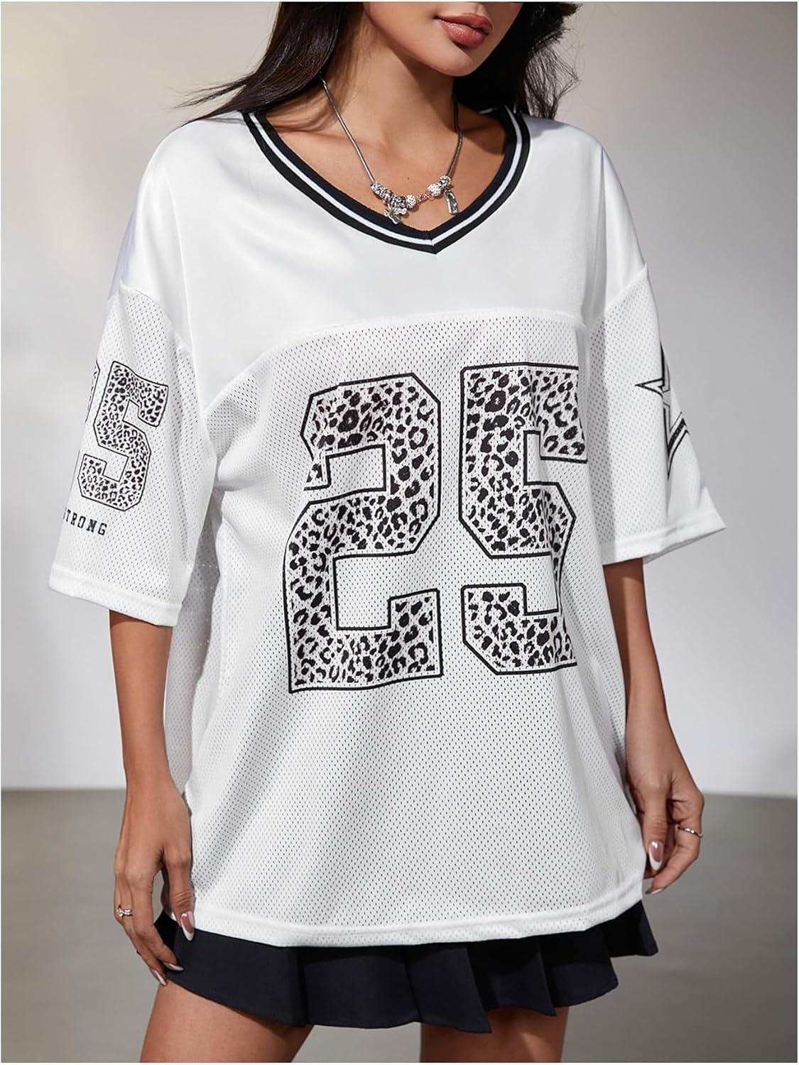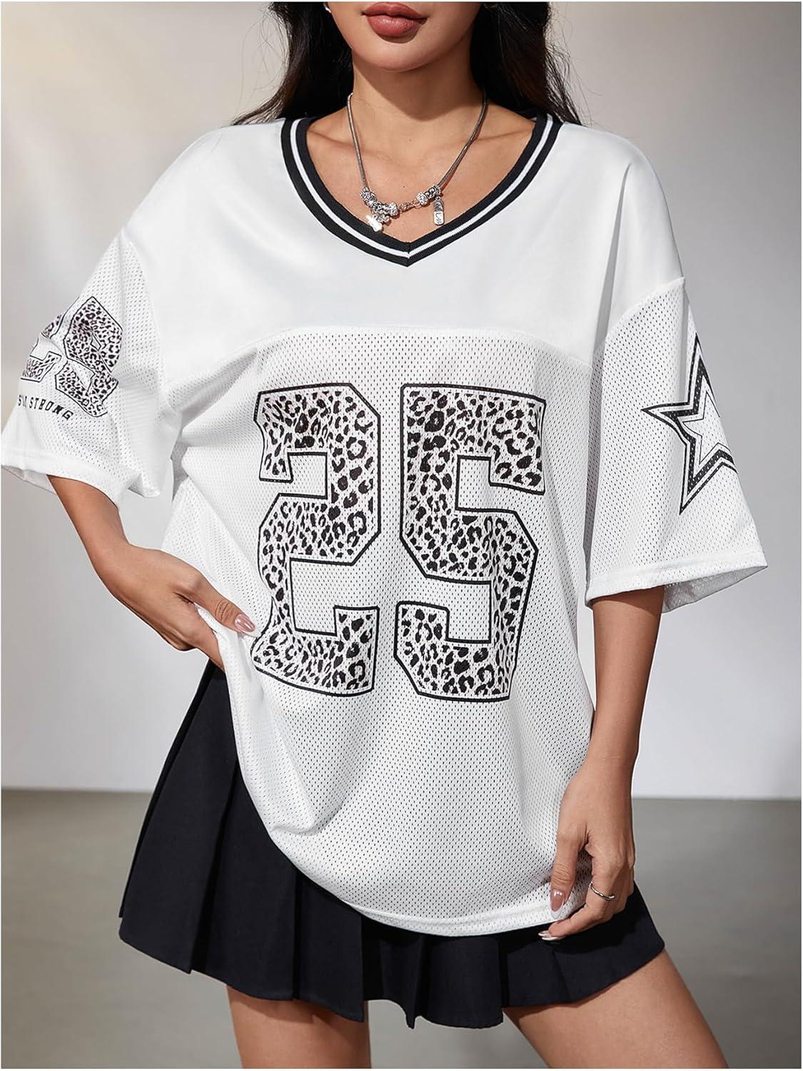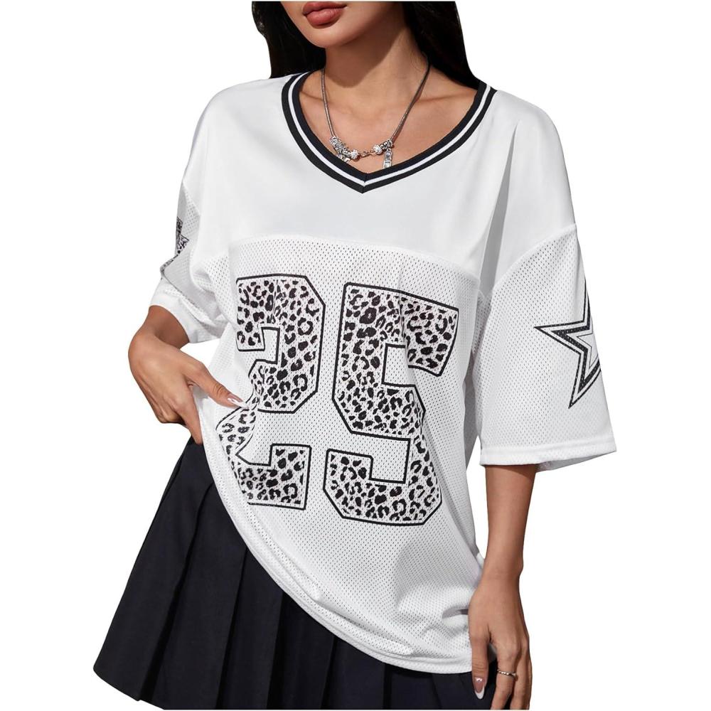 SOLY HUX Jersey Shirts for Women Y2k Graphic Number Oversized Tees V Neck Half Sleeve Cute Soccer Streetwear T Shirt Tops(White Letter Number)