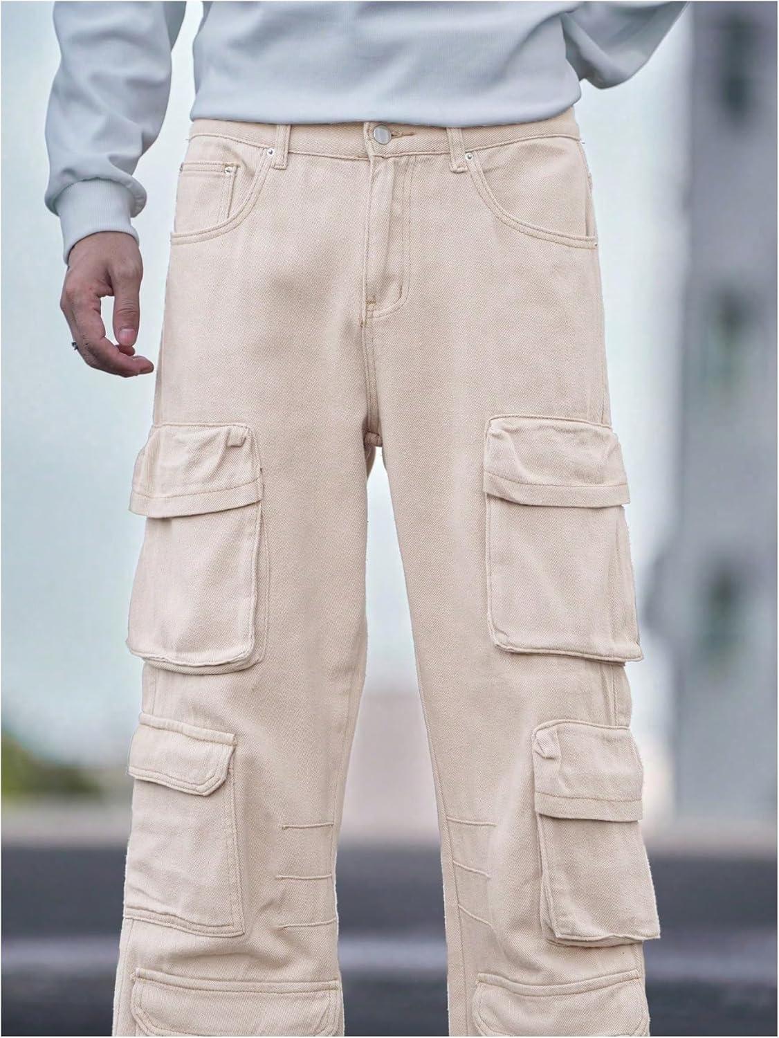 SOLY HUX Men’s Cargo Jeans Y2k Grunge Hip Hop Wide Leg Baggy Denim Pants Streetwear with Pockets(Plain Apricot)