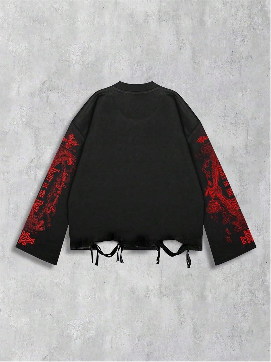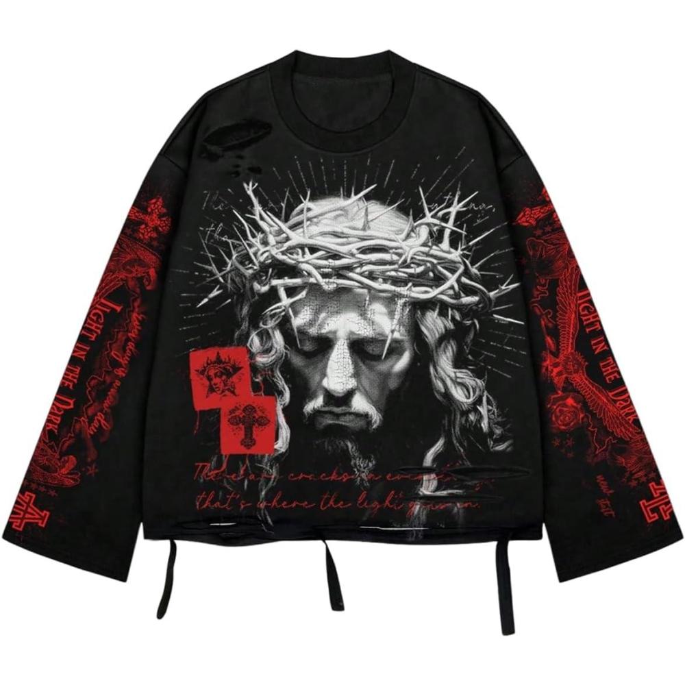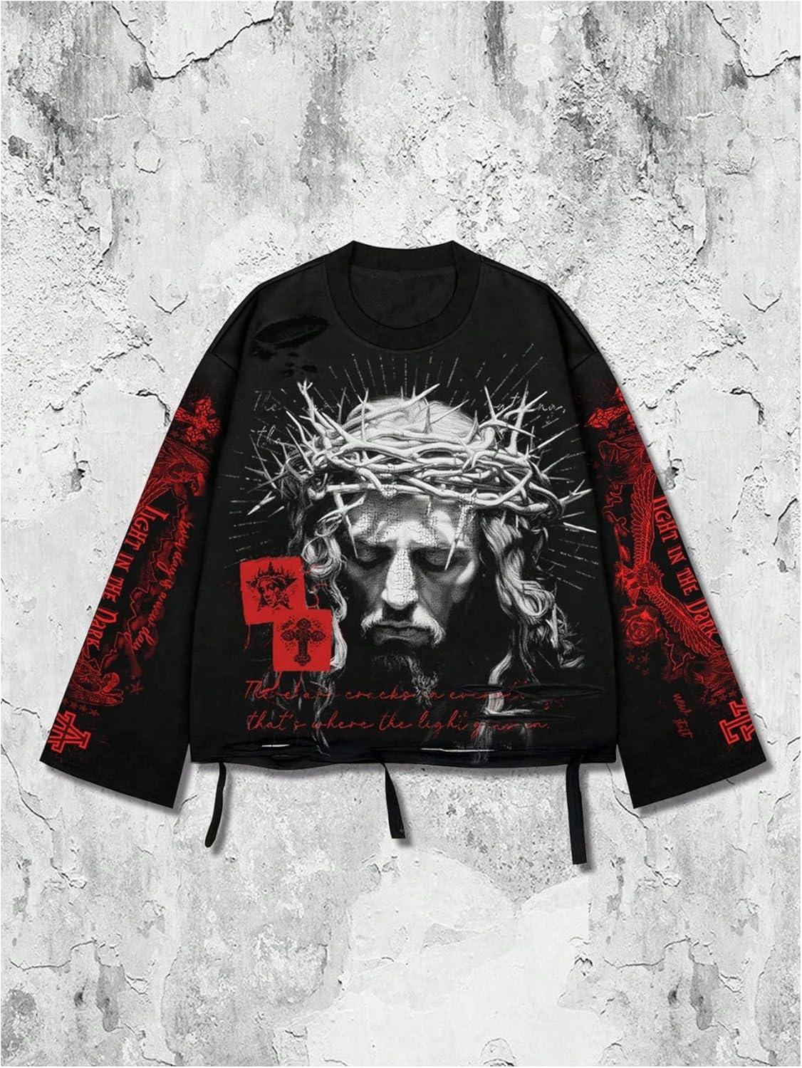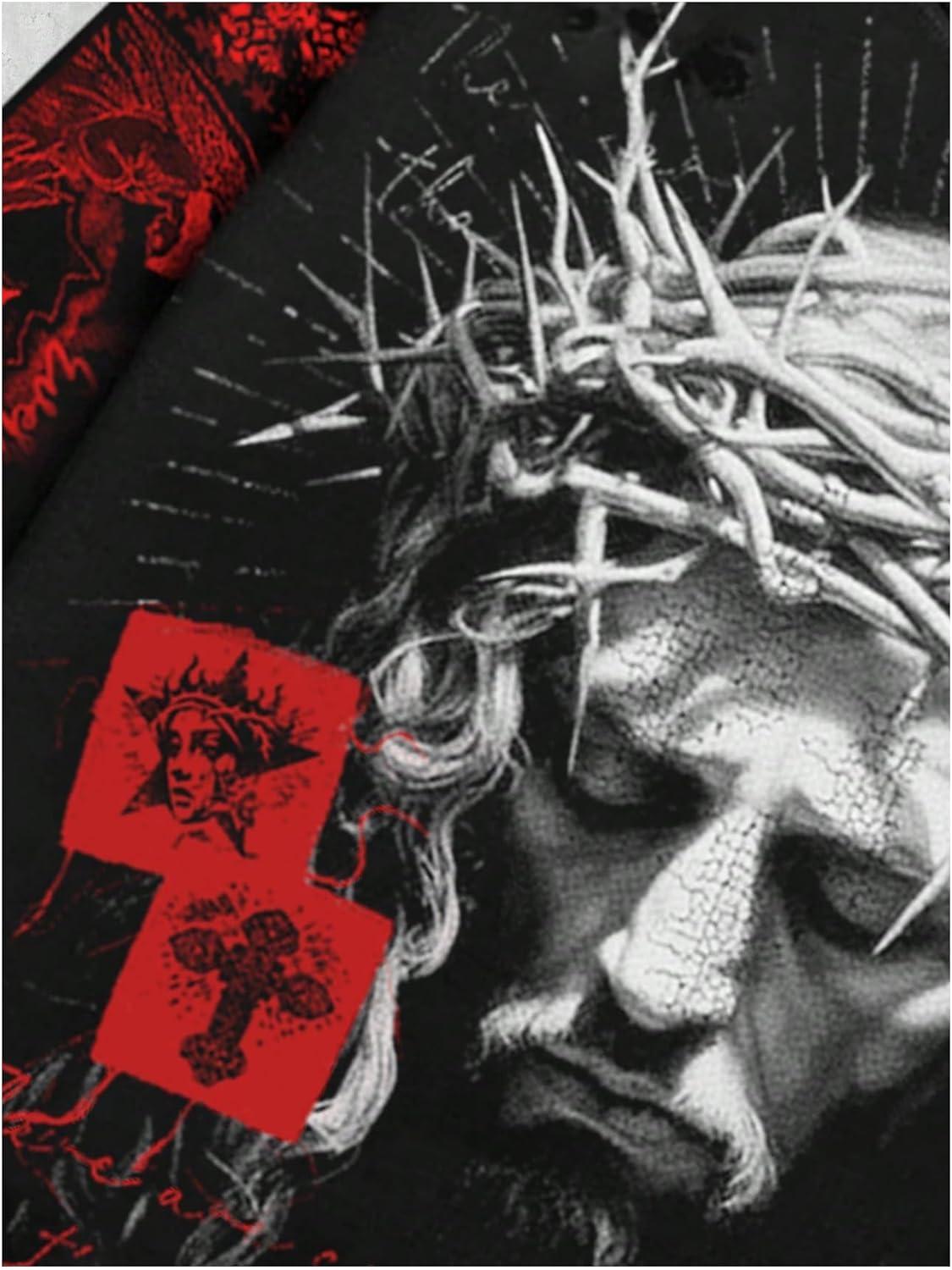 SOLY HUX Men’s Goth Graphic Tees Grunge Jesus Long Sleeve Shirts Crew Neck Hip Hop Tops Streetwear(Black Red Graphic)