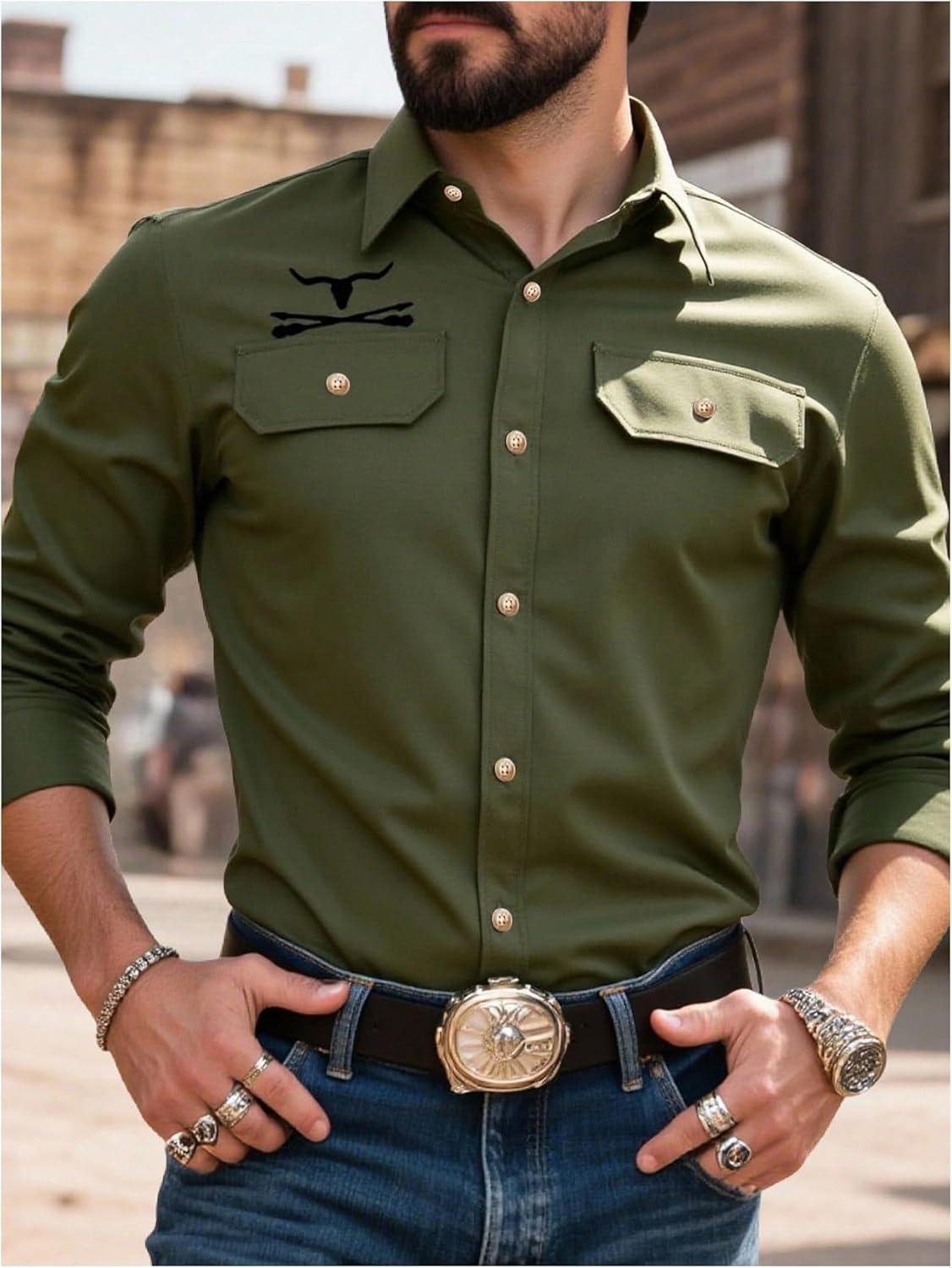 SOLY HUX Men’s Long Sleeve Western Shirts Button Down Collared Shirt Top Cowboy Outfits(Khaki Graphic)