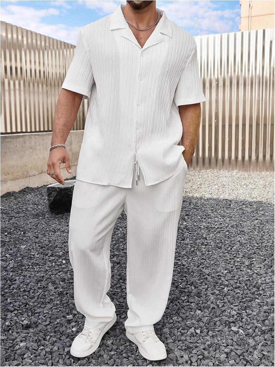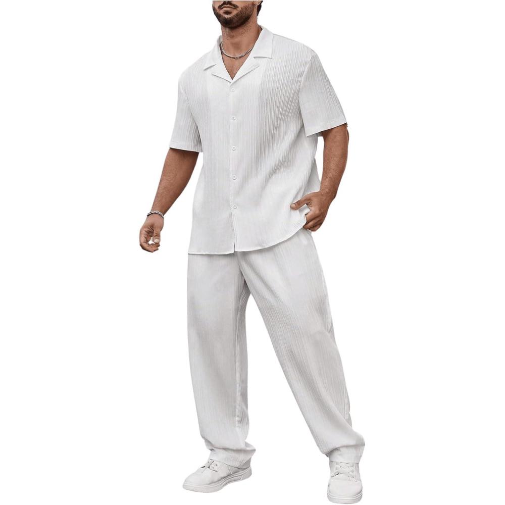 SOLY HUX Men’s Plus Size 2 Piece Outfits Summer Short Sleeve Button Down Shirt and Pants Set(Plain White)