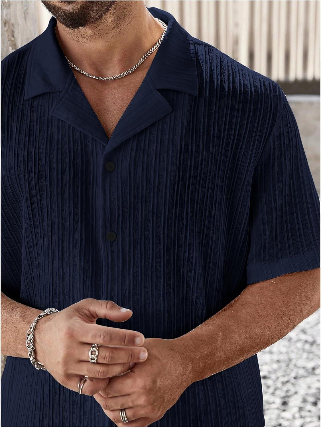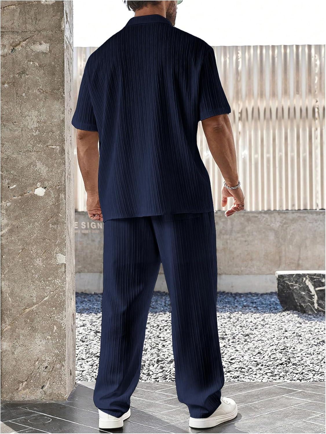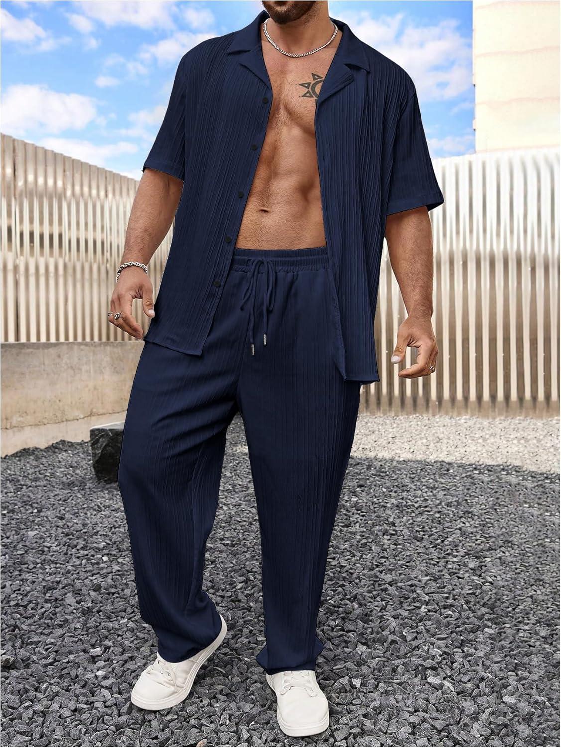 SOLY HUX Men’s Plus Size 2 Piece Outfits Summer Short Sleeve Button Down Shirt and Pants Set(Pure Dark Blue)