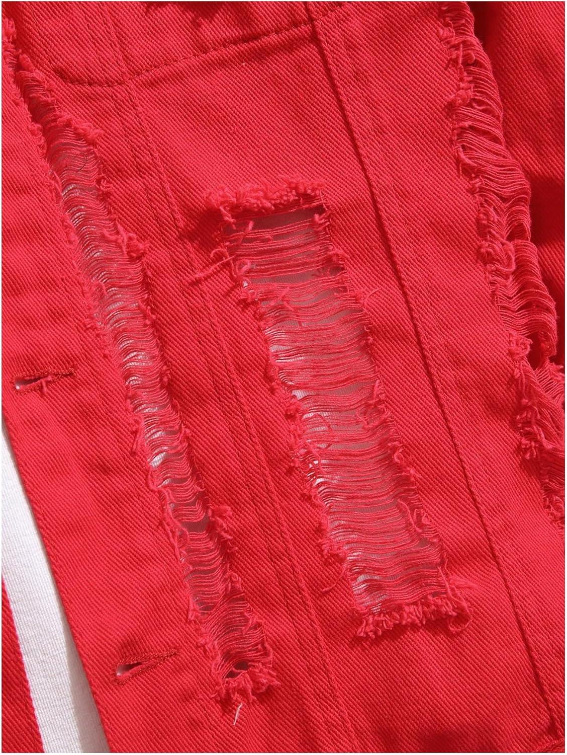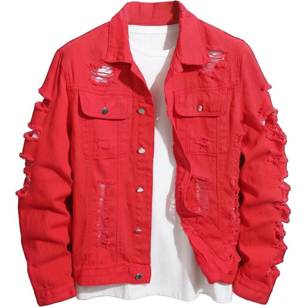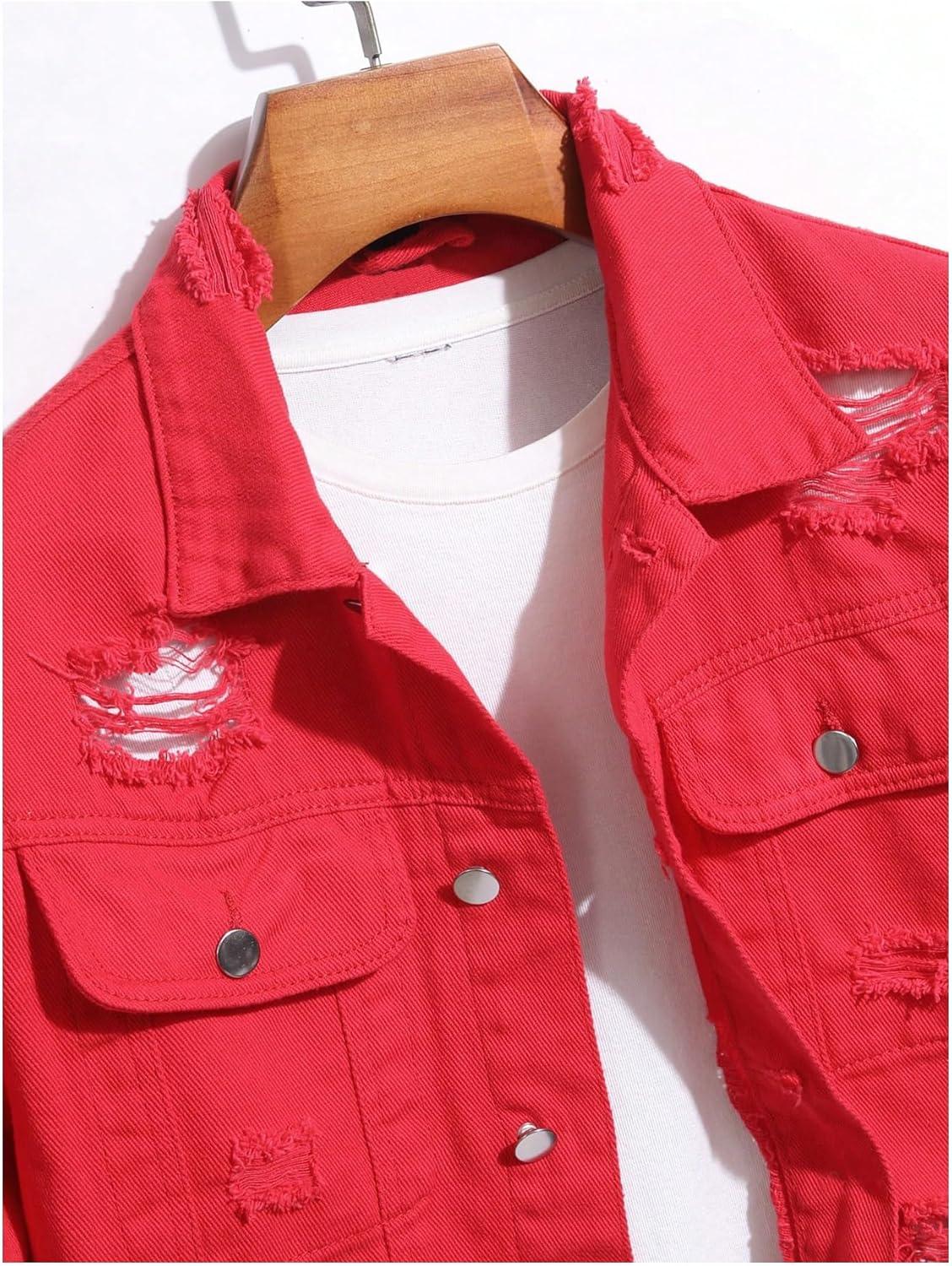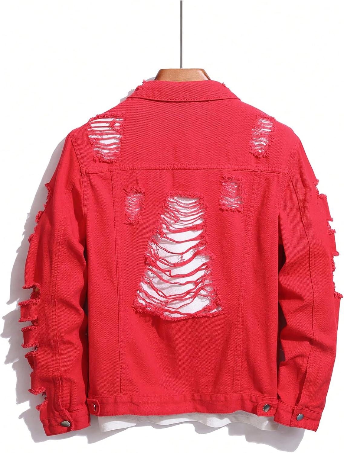 SOLY HUX Men’s Ripped Denim Jacket Button Front Collared Long Sleeve Grunge Jean Jackets Streetwear(Pure Red)