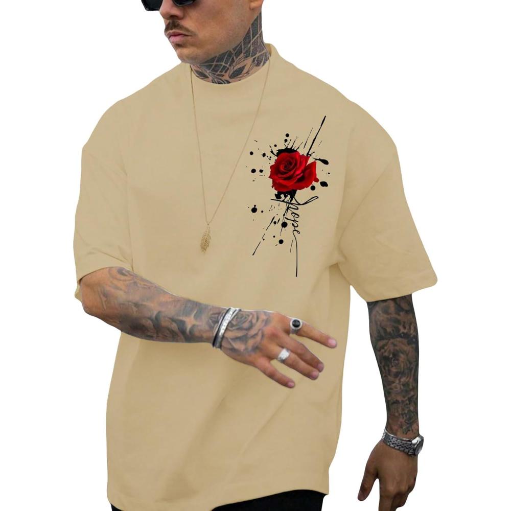 SOLY HUX Men’s Rose Print Graphic Tees Oversized T Shirt Summer Tops Casual(Khaki Rose)