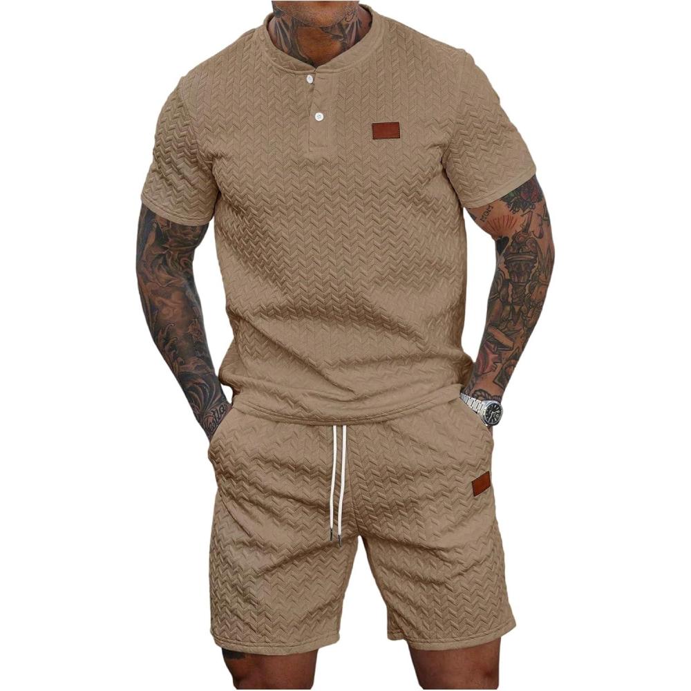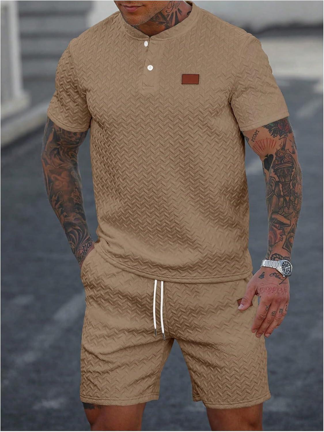 SOLY HUX Men’s Summer 2 Piece Outfit Textured T Shirt and Shorts Set Short Sleeve Casual Tracksuits(Plain Khaki)
