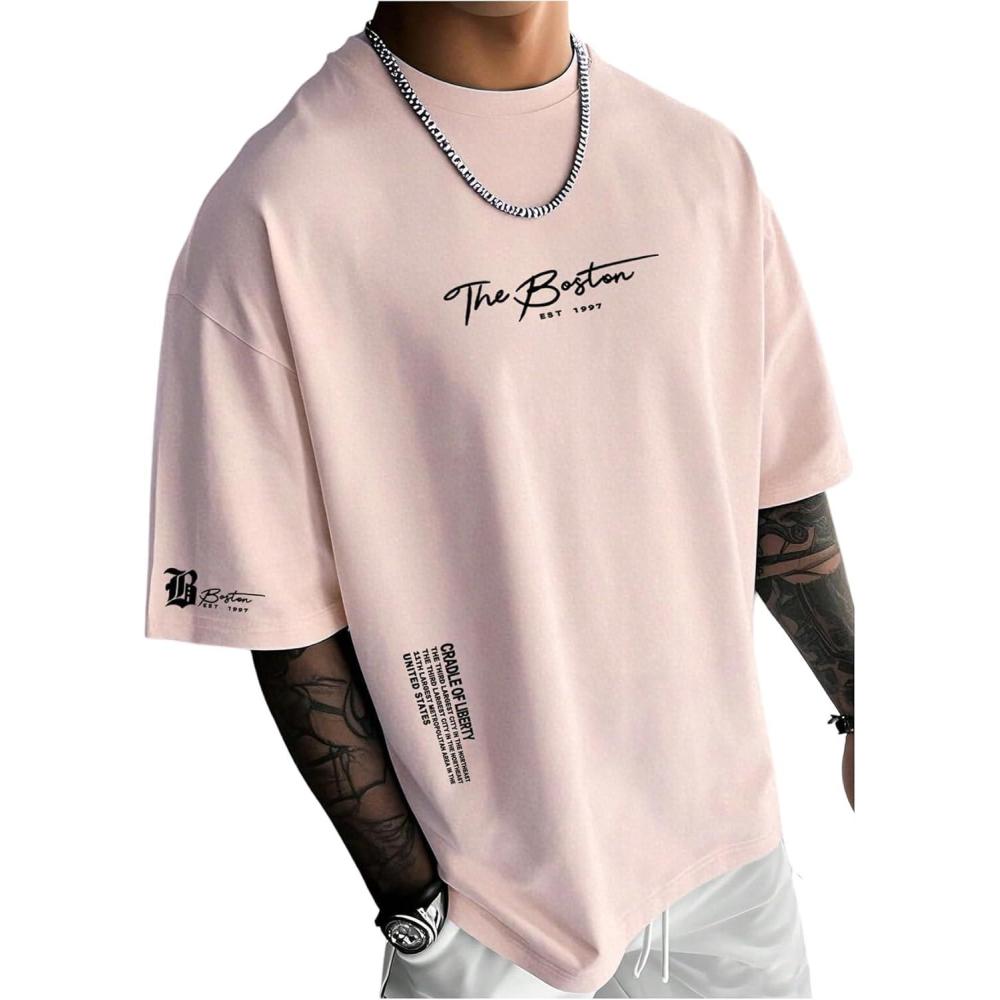 SOLY HUX Men’s Summer Letter Graphic Tees Casual Short Sleeve Crew Neck T Shirts(Pink Letter)