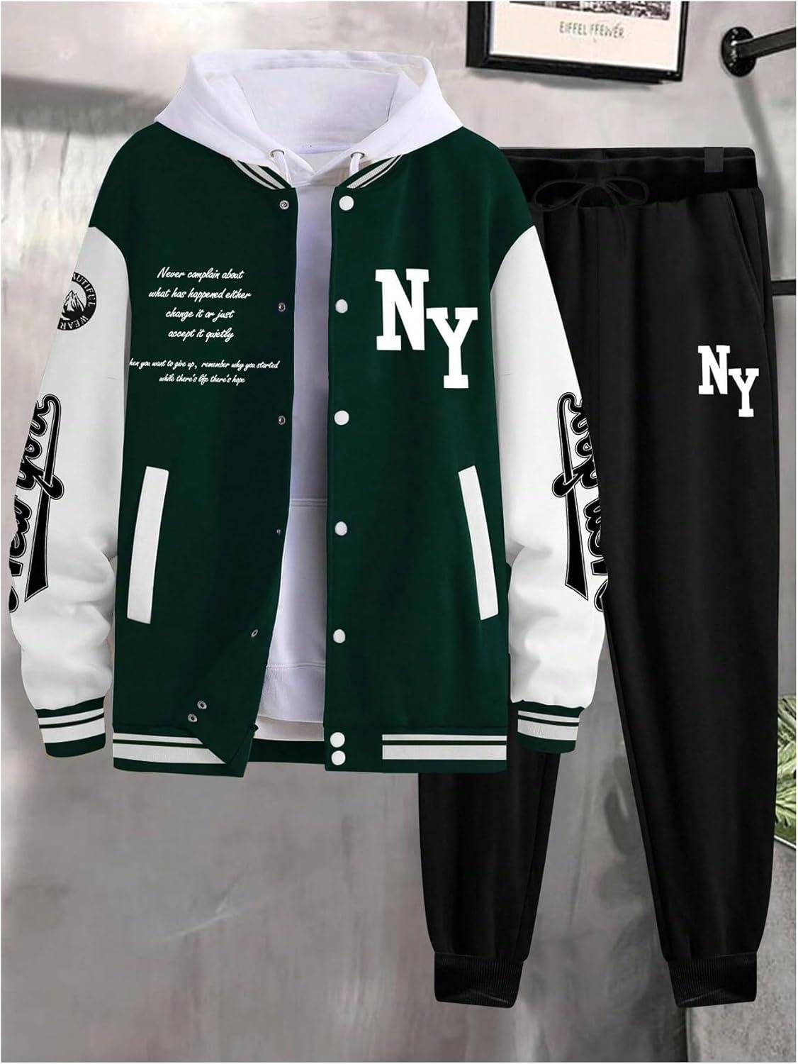 SOLY HUX Men’s Tracksuit 2 Piece Outfits Color Block Letter Graphic Long Sleeve Varsity Jacket and Pants Set(Green and Black Letter Graphic)