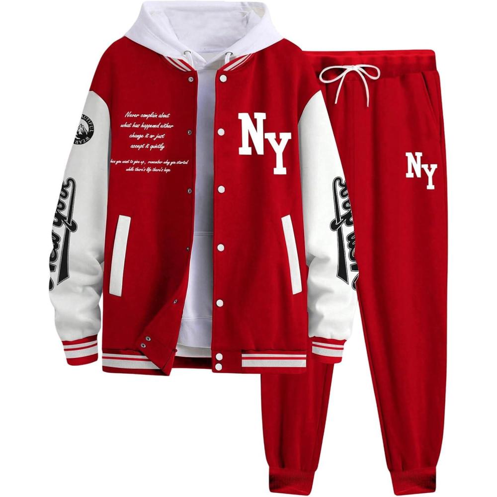 SOLY HUX Men’s Tracksuit 2 Piece Outfits Color Block Letter Graphic Long Sleeve Varsity Jacket and Pants Set(Red Letter Graphic)