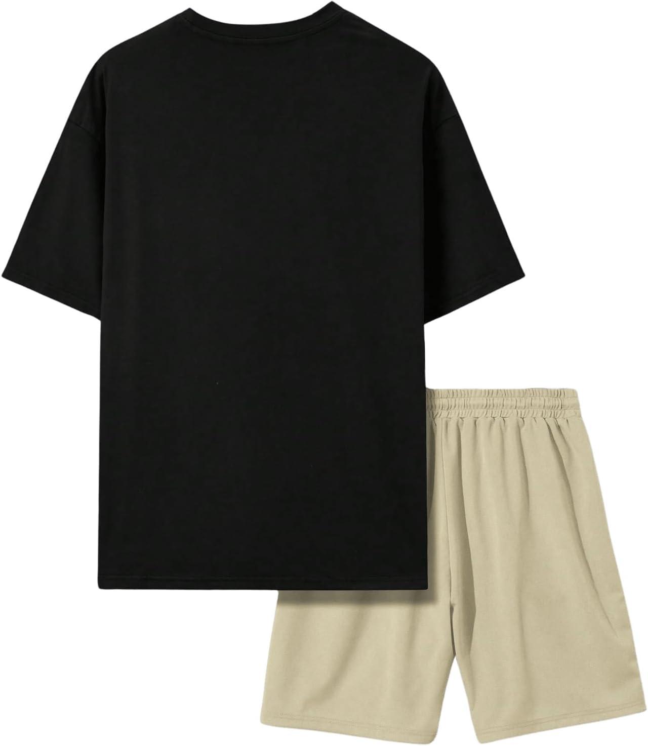 SOLY HUX Men’s Tracksuits Color Block Print Short Sleeve Tee and Drawstring Shorts Summer 2 Piece Sets(Black Beige Multi)