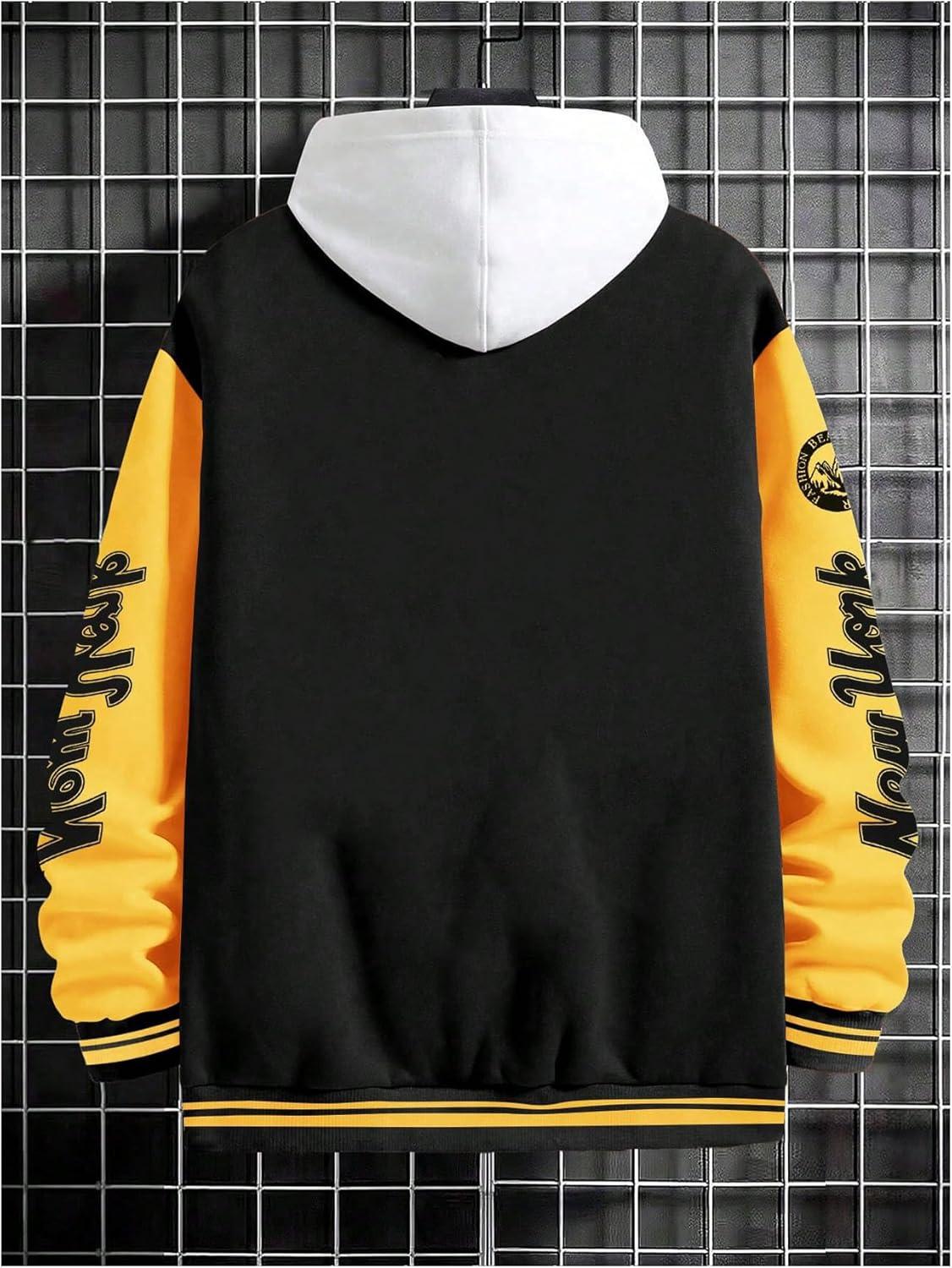 SOLY HUX Men’s Varsity Jacket Color Block Letter Graphic Long Sleeve Baseball Jacket Bomber Coat(Black and Yellow Letter)