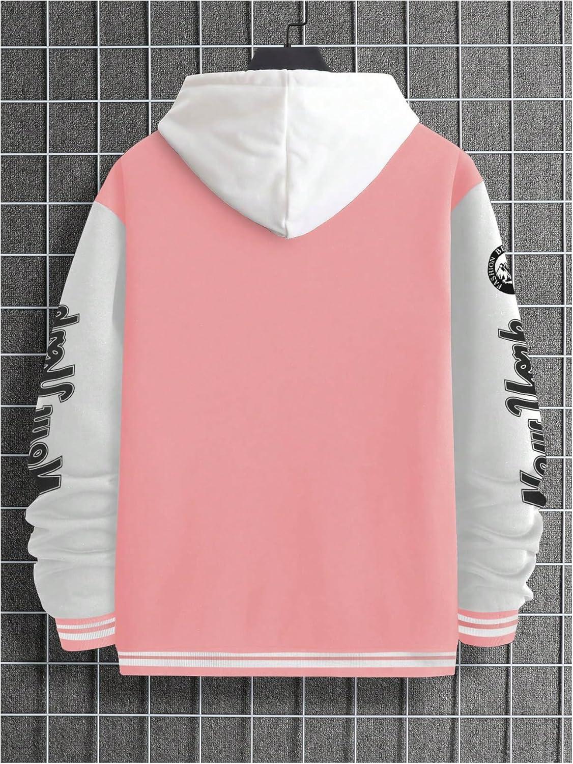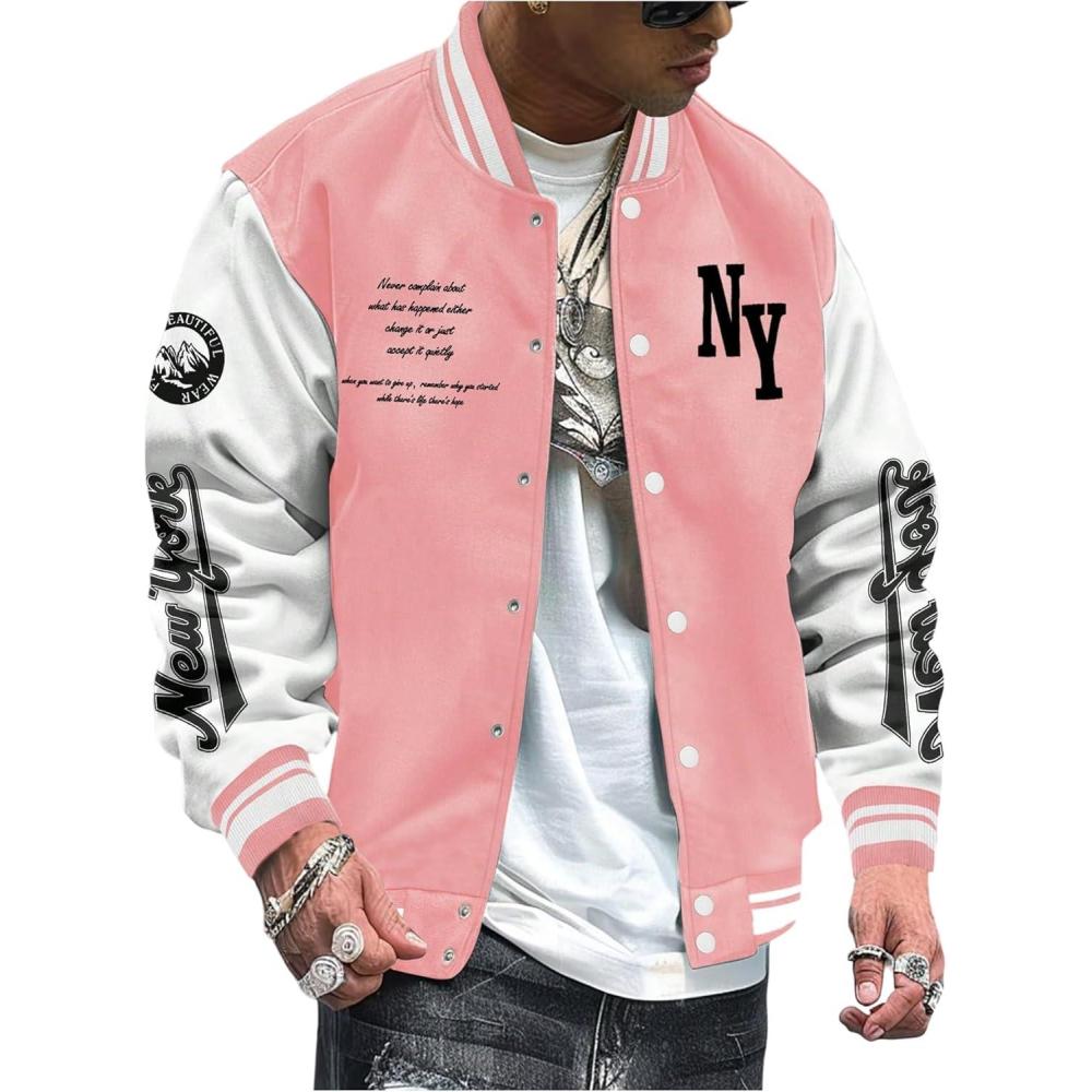 SOLY HUX Men’s Varsity Jacket Color Block Letter Graphic Long Sleeve Baseball Jacket Bomber Coat(Pink Letter Graphic)