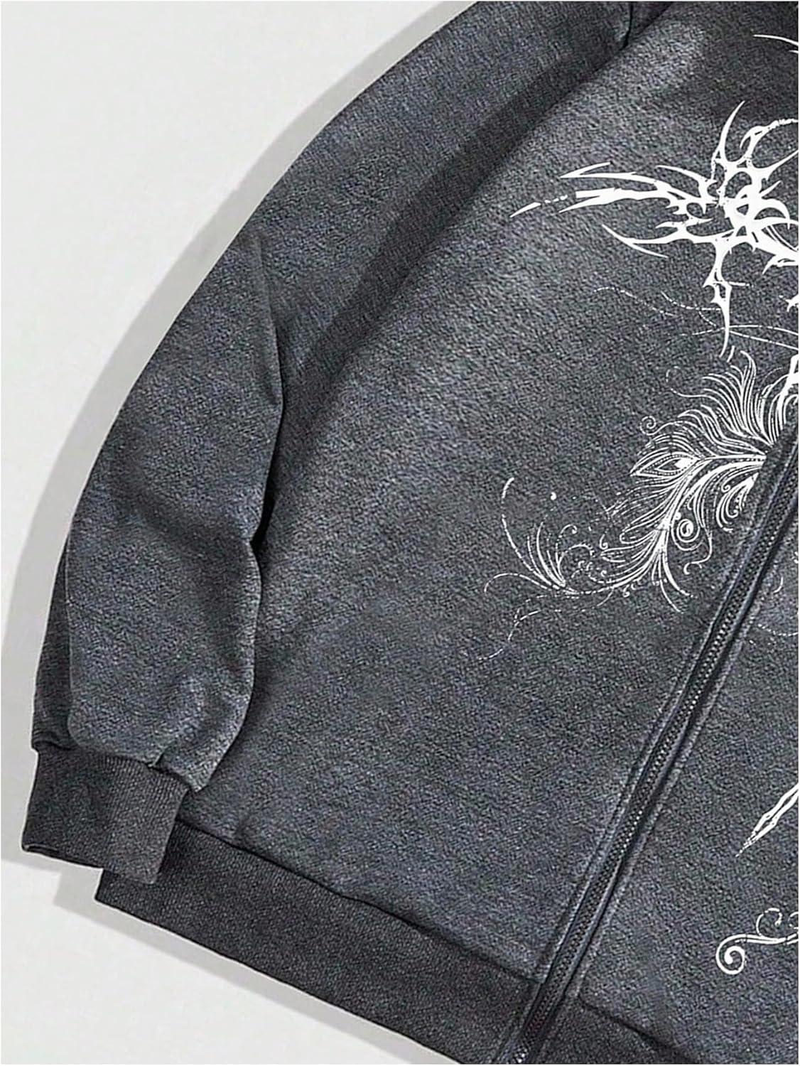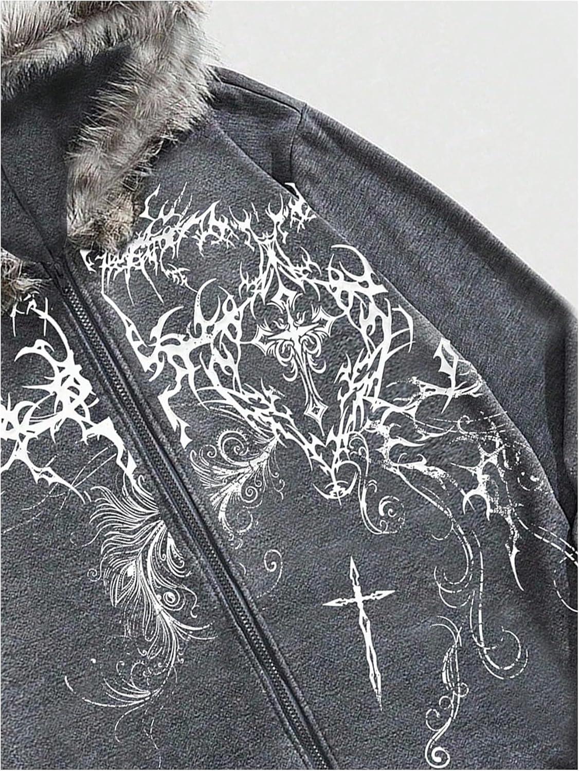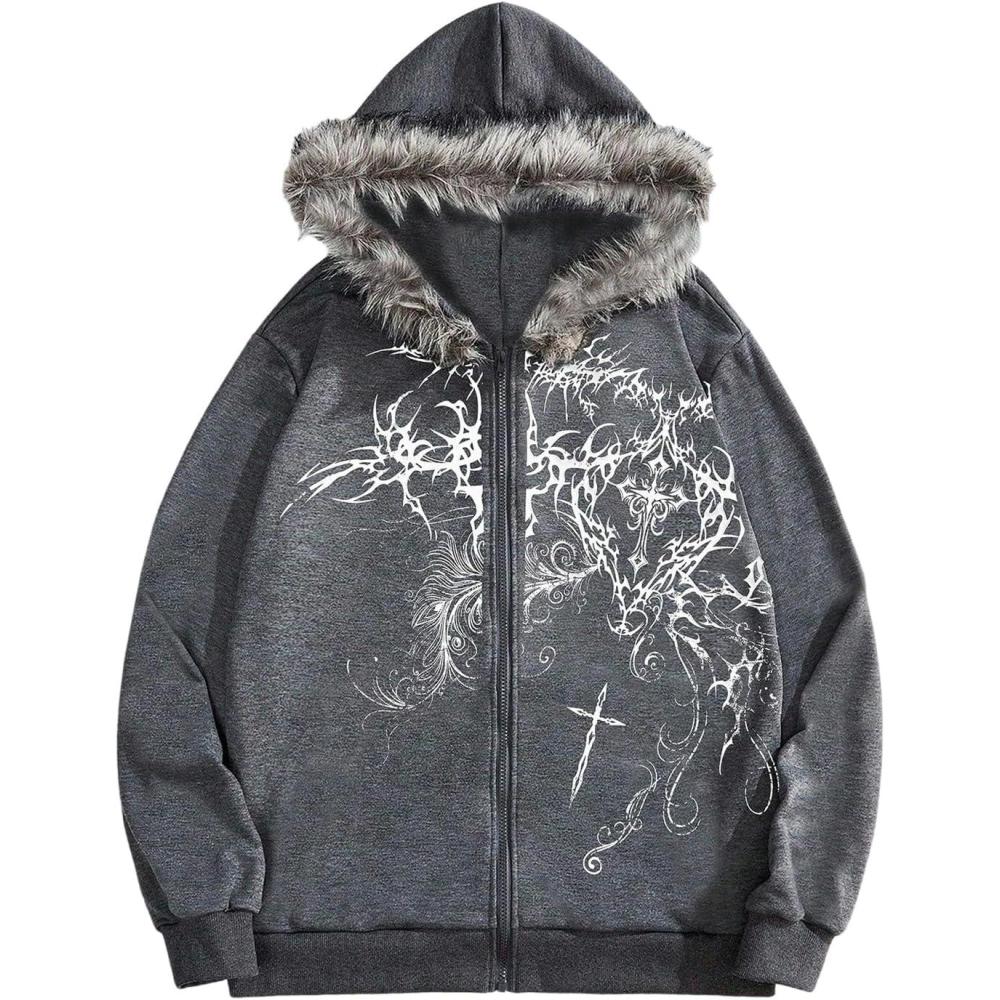 SOLY HUX Men’s Y2k Grunge Zip Up Hoodie Sweatshirts Gothic Fur Hooded Jacket Streetwear(Grey Graphic Print)