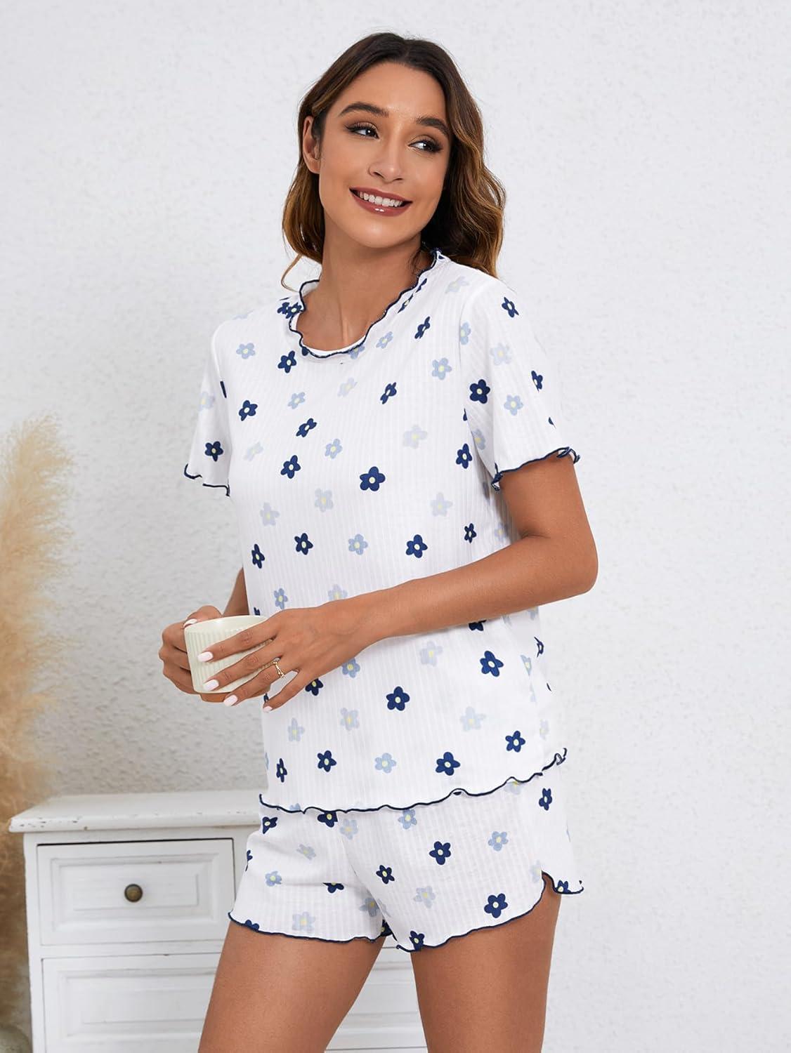 SOLY HUX Pajama Set for Women Cute Print Short Sleeve Tee and Shorts Lounge Sleepwear(Blue and White Floral Print)