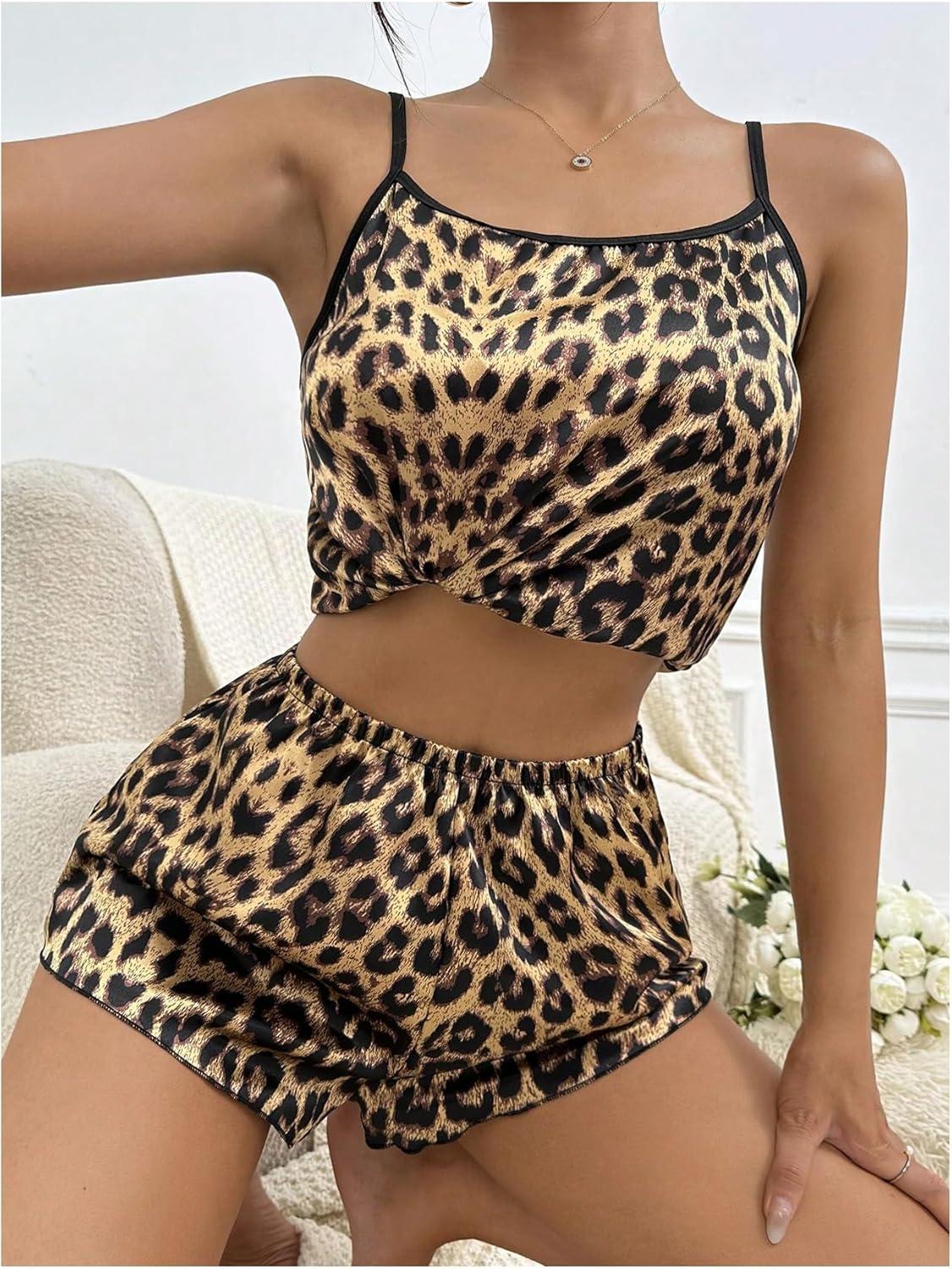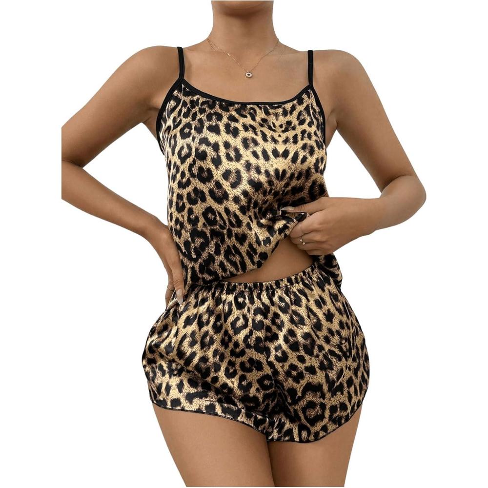 SOLY HUX Pajama Sets for Women 2 Piece Leopard Print Satin Sleepwear Cami Top and Shorts Loungewear(Multicoloured Leopard)