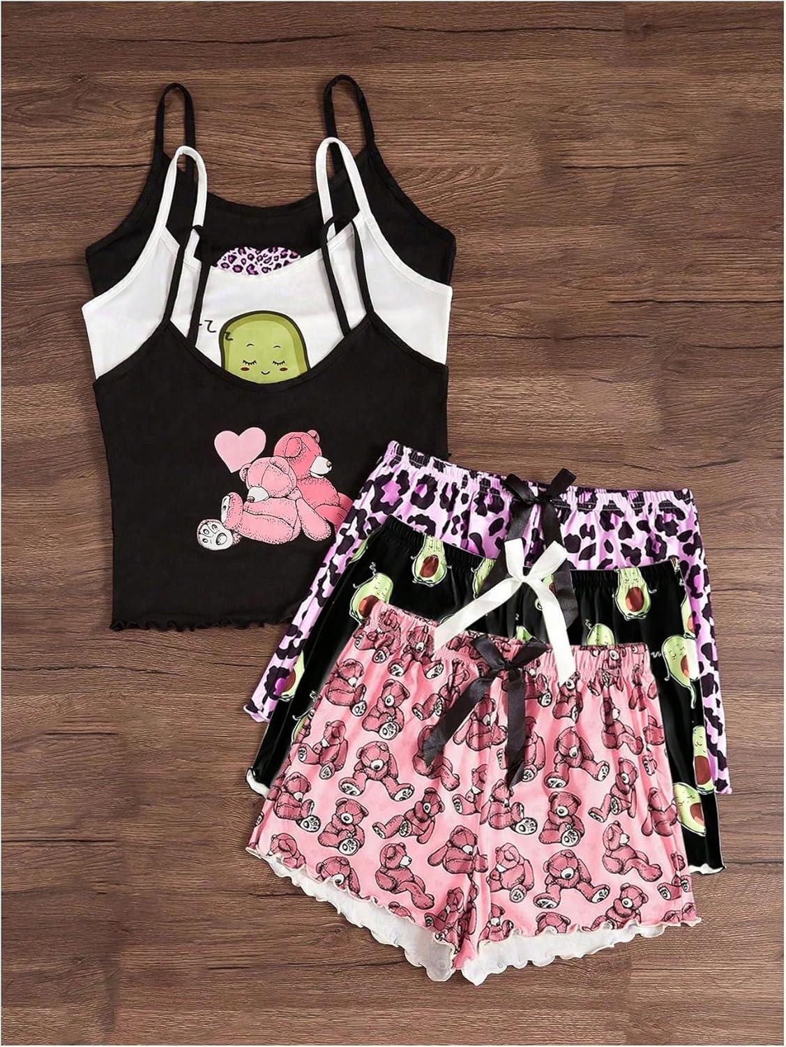 SOLY HUX Pajama Sets for Women 6 Piece Cute Graphic Print Sleepwear Cami Top and Shorts Loungewear(Multicoloured)