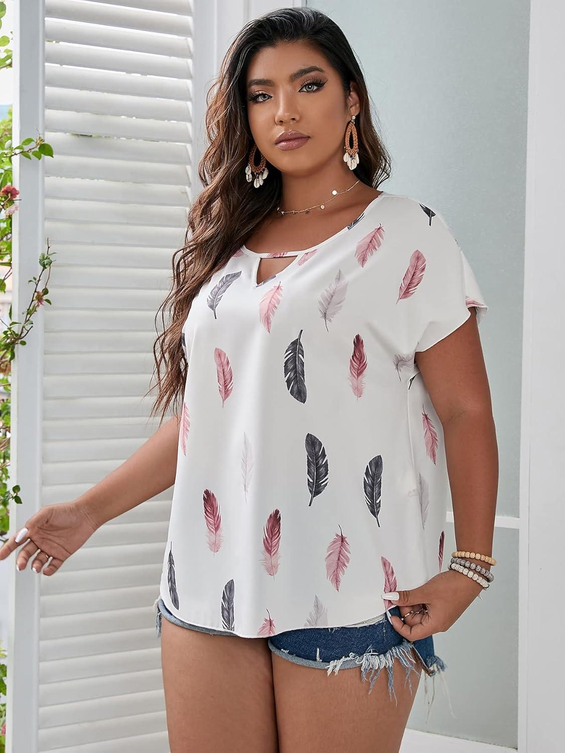 SOLY HUX Plus Size Blouses for Curvy Women Cute Boho Striped Print Shirts V Neck Casual Summer Blouses T-Shirts Tops(Black Multi Feather)