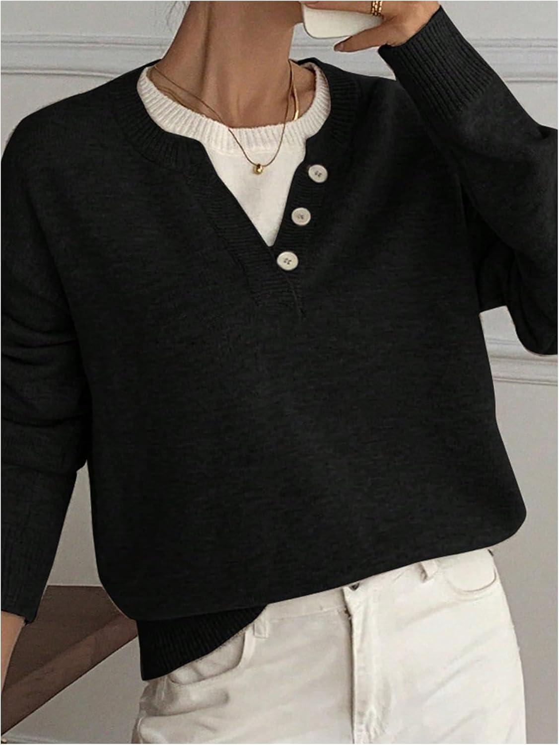 SOLY HUX Pullover Sweaters for Women Long Sleeve Button Crew Neck 2 in 1 Knitted Oversized Tops(Pure Black)