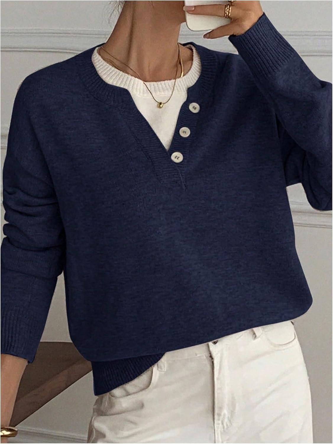 SOLY HUX Pullover Sweaters for Women Long Sleeve Button Crew Neck 2 in 1 Knitted Oversized Tops(Solid Dark Blue)