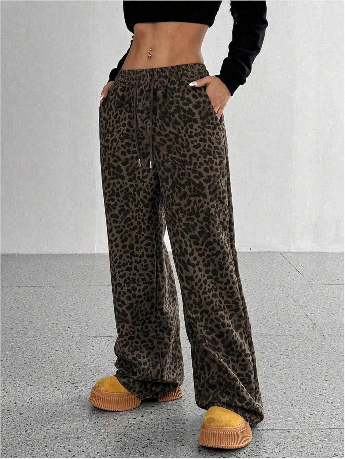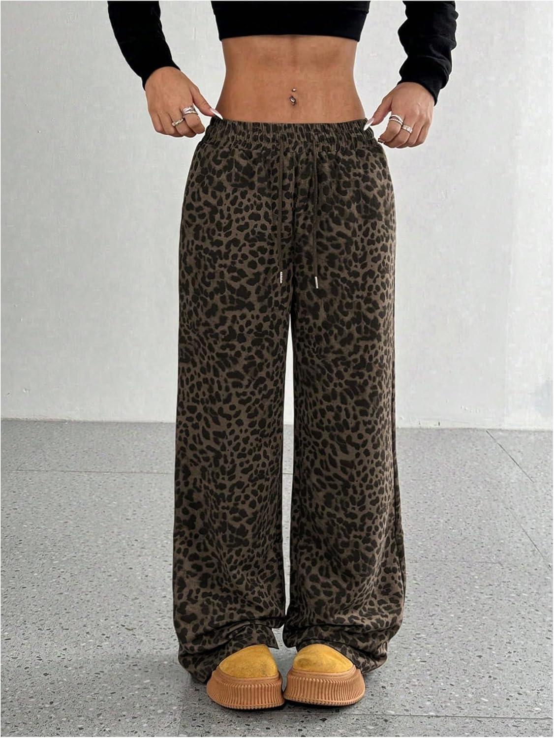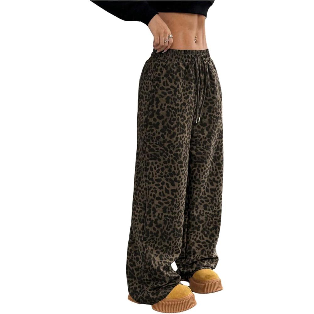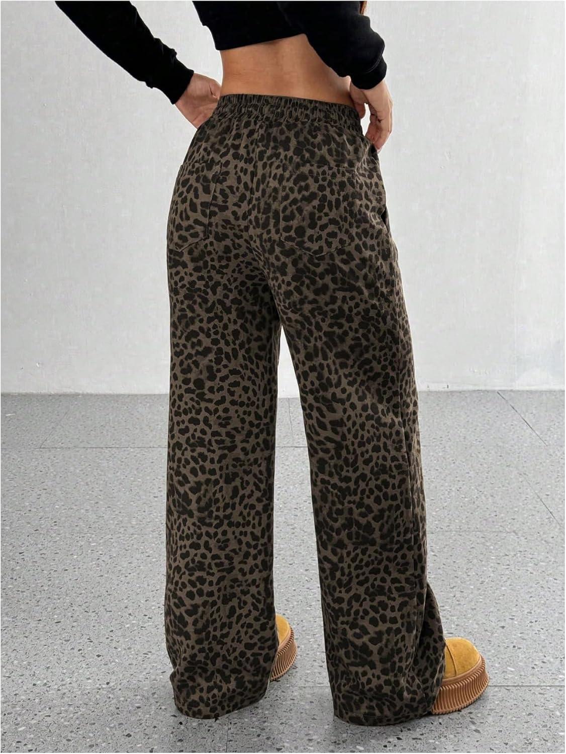 SOLY HUX Wide Leg Jeans for Women Leopard Print Y2K Pants Elastic Waist Baggy Casual Loose Trousers with Pockets(Brown Leopard)