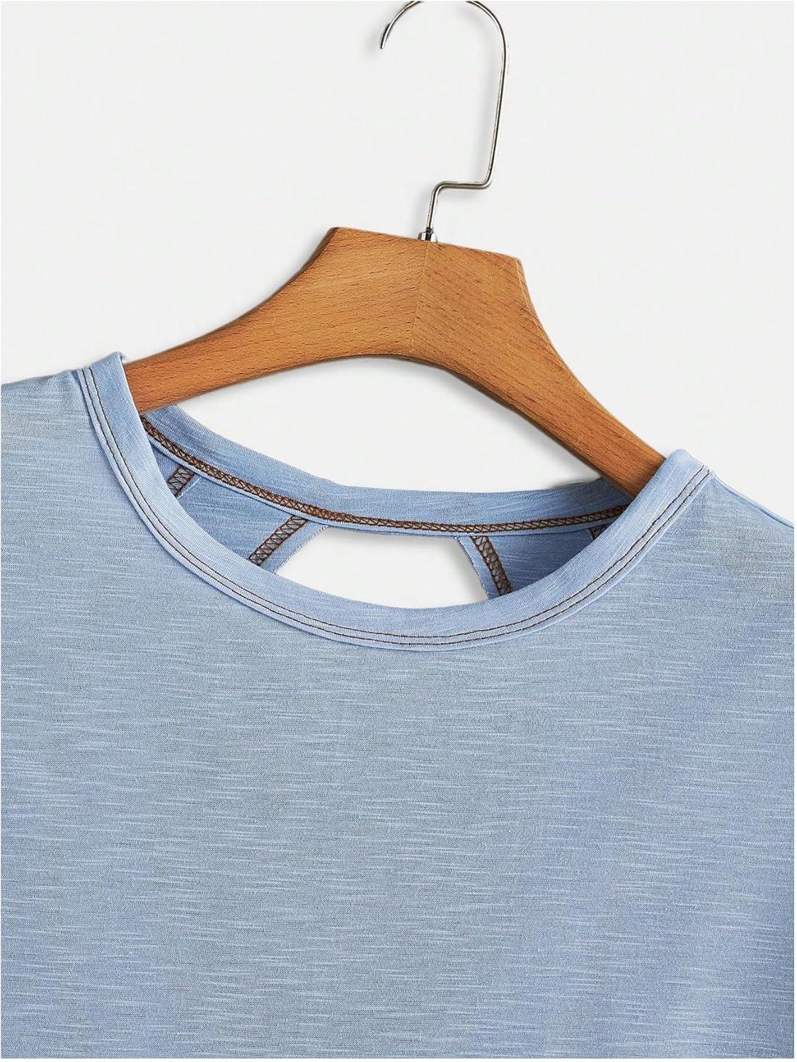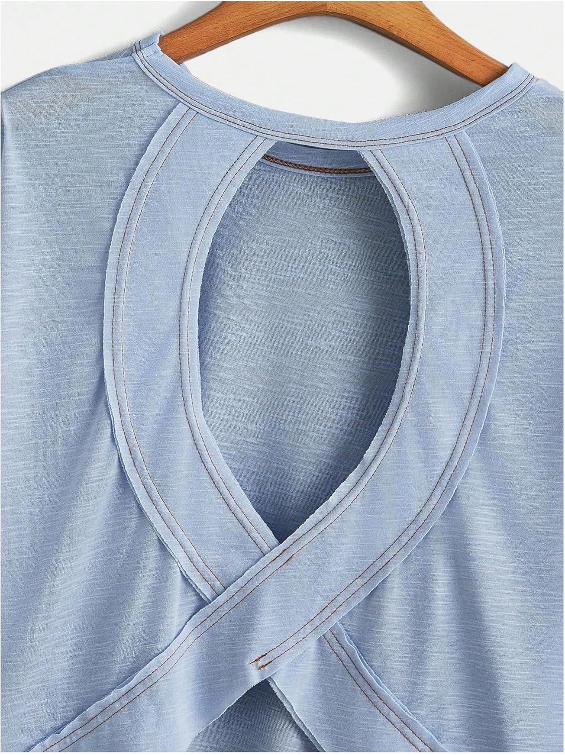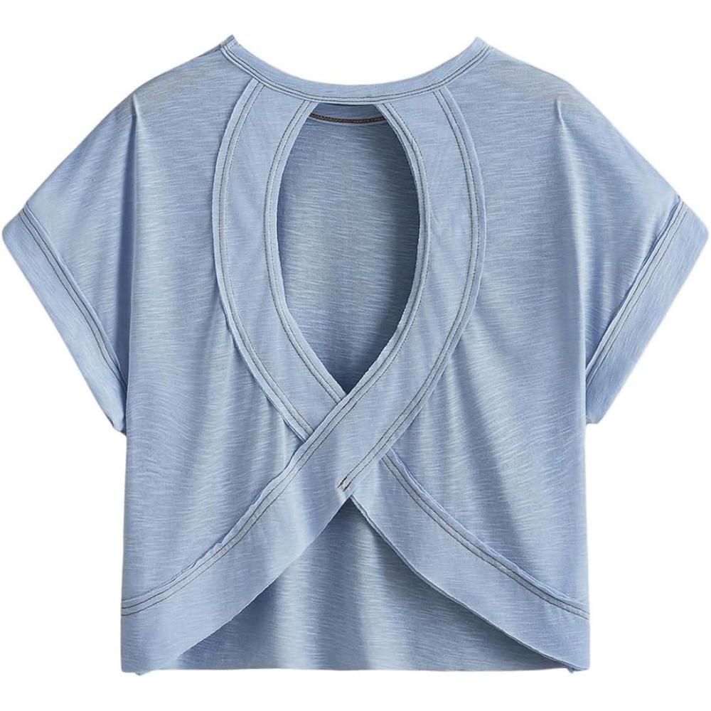 SOLY HUX Women Open Back Tops Workout Backless Tee Casual Athletic Shirts Short Sleeve Oversized Gym T Shirt(Plain Light Blue)