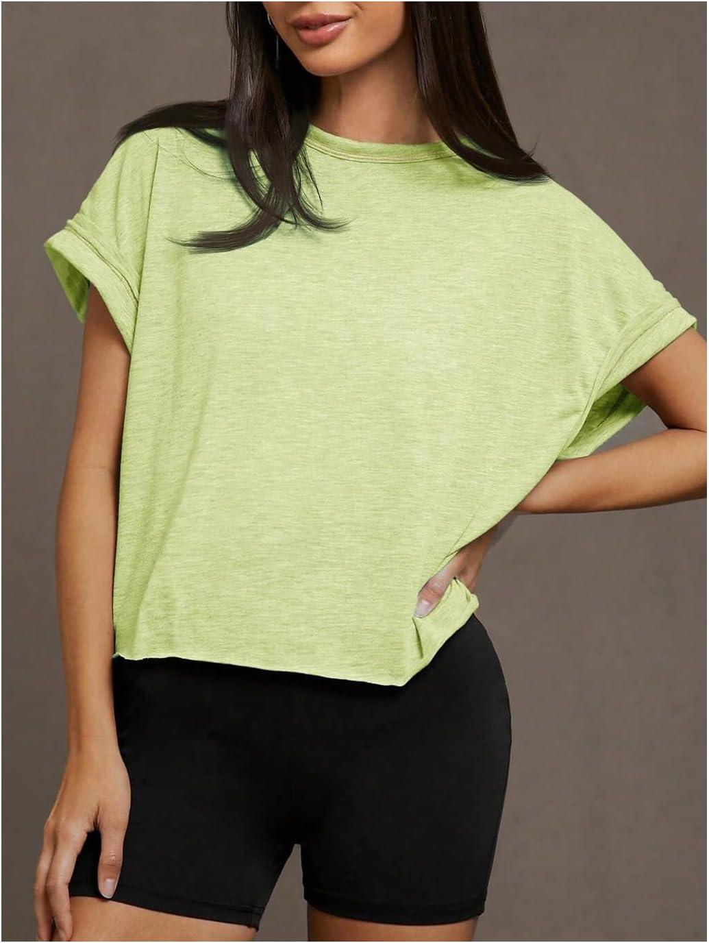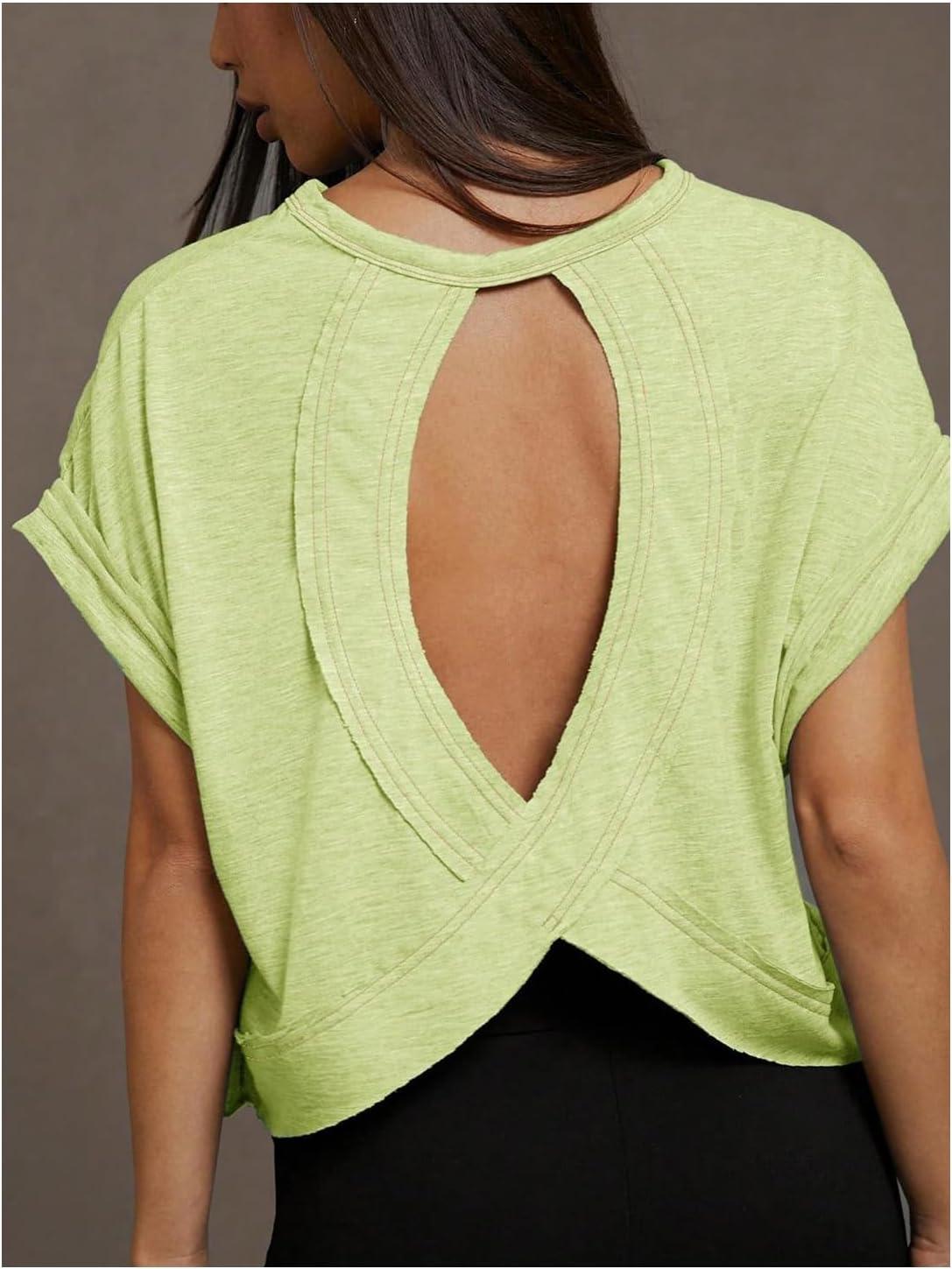 SOLY HUX Women Open Back Tops Workout Backless Tee Casual Athletic Shirts Short Sleeve Oversized Gym T Shirt(Plain Lime Green)