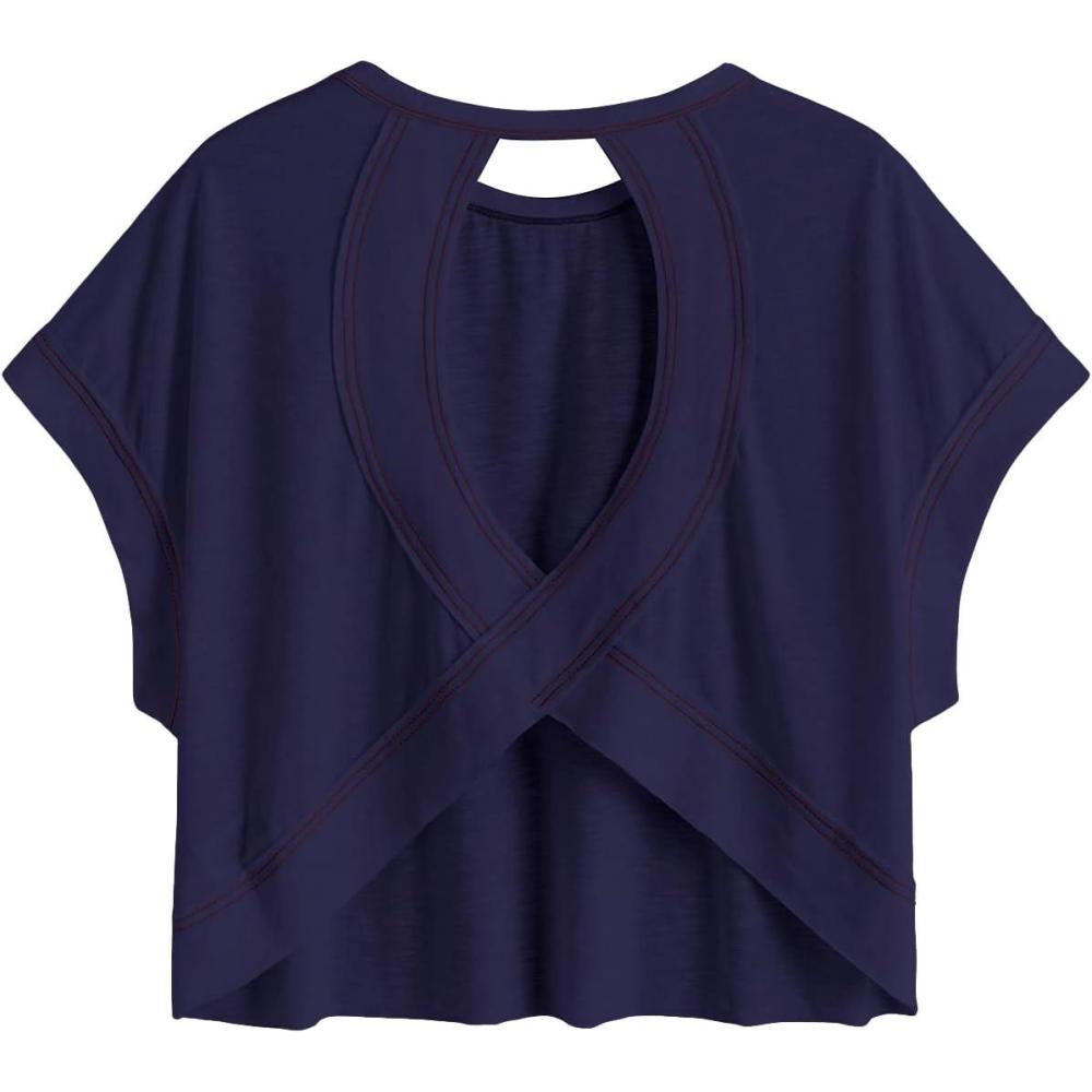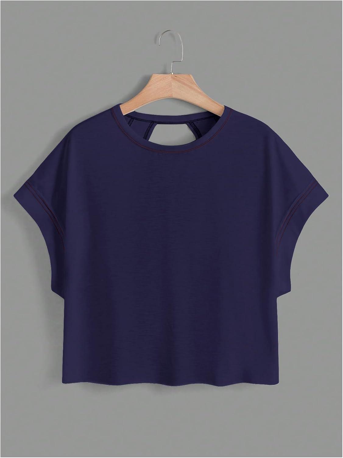 SOLY HUX Women Open Back Tops Workout Backless Tee Casual Athletic Shirts Short Sleeve Oversized Gym T Shirt(Solid Dark Blue)