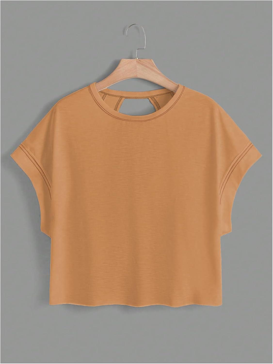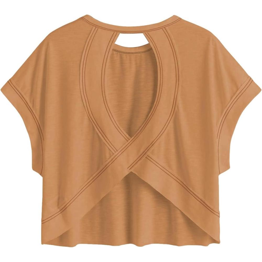 SOLY HUX Women Open Back Tops Workout Backless Tee Casual Athletic Shirts Short Sleeve Oversized Gym T Shirt(Solid Khaki)